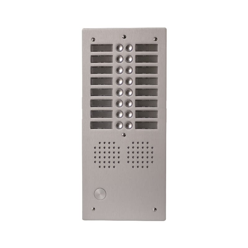 Platine HAUT-RISQUE audio analogique (1+N) • 2 rangées 16 boutons • Aluminium 5 mm d'épaisseur • Pré-percée lect. VIGIK® + cache • Vis anti-vandales Prévoir groupe audio UAV4187/002