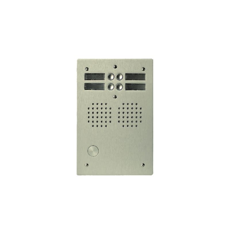 Platine HAUT-RISQUE audio analogique (1+N) • 2 rangées 4 boutons • Aluminium 5 mm d'épaisseur champagne • Pré-percée lect. VIGIK® + cache • Vis anti-vandales Prévoir groupe audio UAV4187/002