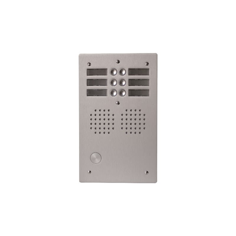 Platine HAUT-RISQUE audio analogique (1+N) • 2 rangées 6 boutons • Aluminium 5 mm d'épaisseur • Pré-percée lect. VIGIK® + cache • Vis anti-vandales Prévoir groupe audio UAV4187/002