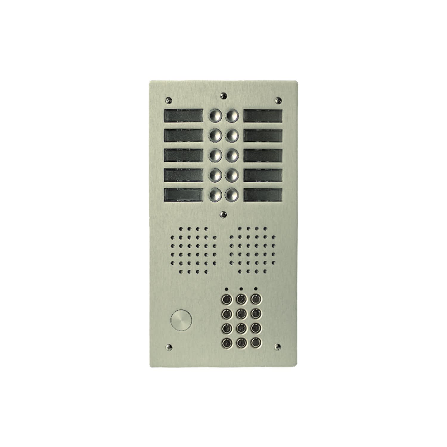Platine HAUT-RISQUE audio analogique (1+N) + clavier 99 codes • 2 rangées 10 boutons • Aluminium 5 mm d'épaisseur champagne • Pré-percée lect. VIGIK® + cache • Vis anti-vandales Prévoir groupe audio UAV4187/002