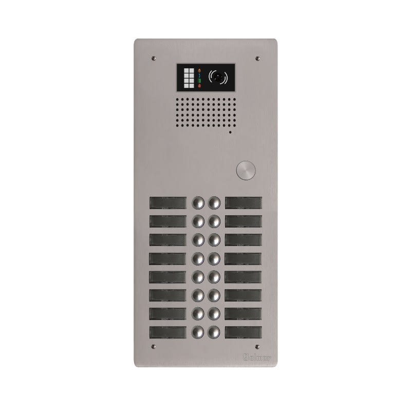 Platine HAUT-RISQUE audio ou vidéo BUS 2 fils non polarisé G2P • 2 rangées 16 boutons • Aluminium 5 mm d'épaisseur • Pré-percée lect. VIGIK® + cache • Vis anti-vandales Prévoir groupe audio GEL642/G2P ou vidéo GEL632/G2P