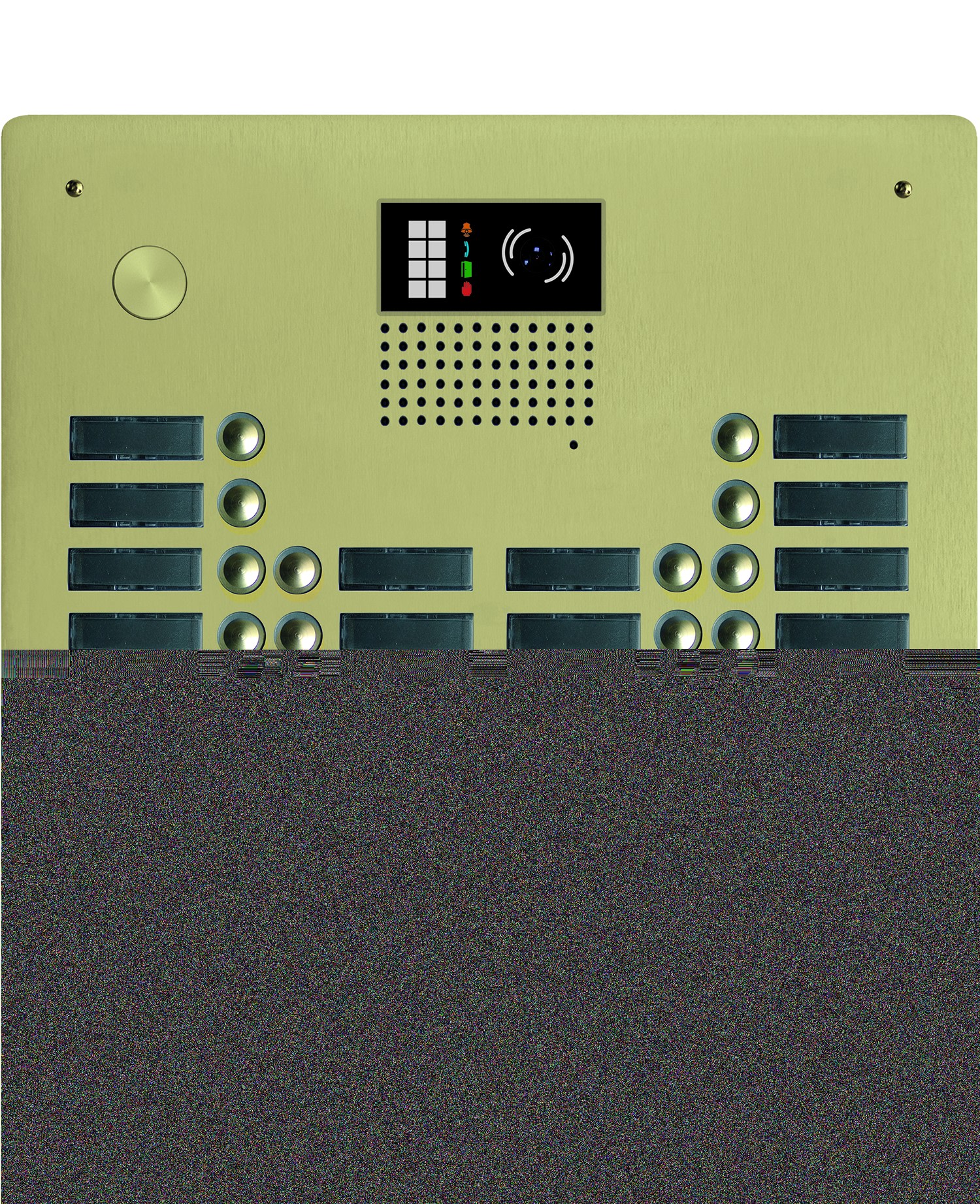 Platine HAUT-RISQUE audio ou vidéo BUS 2 fils non polarisé G2P • 4 rangées 32 boutons • Aluminium 5 mm d'épaisseur champagne • Pré-percée lect. VIGIK® + cache • Vis anti-vandales Prévoir groupe audio GEL642/G2P ou vidéo GEL632/G2P