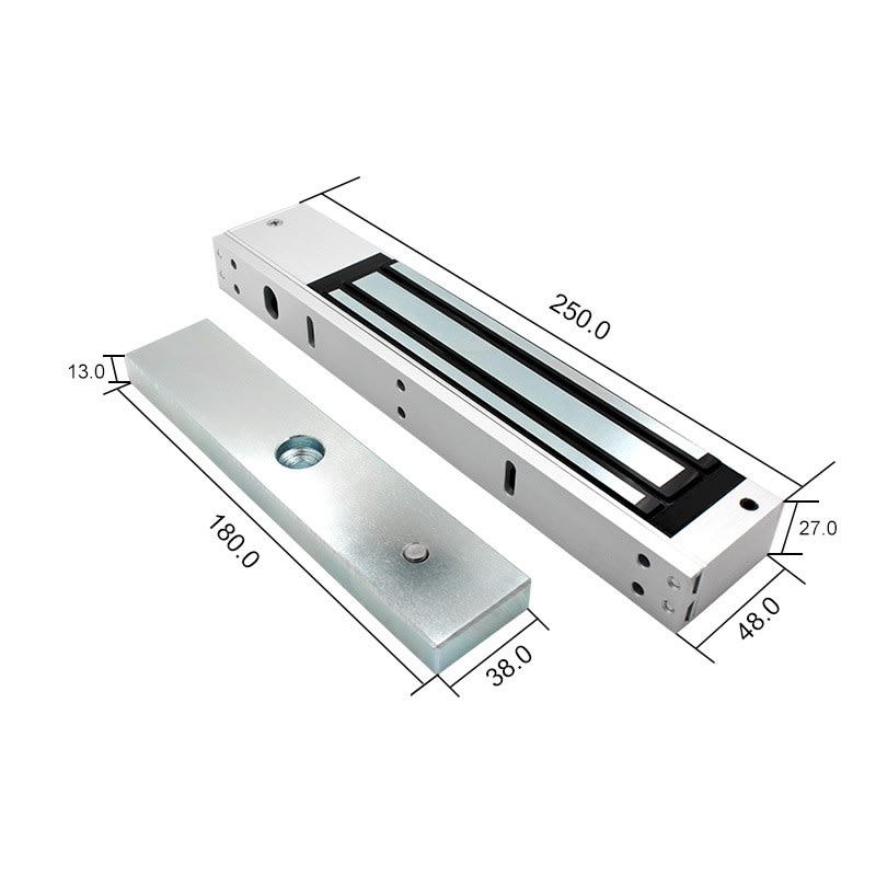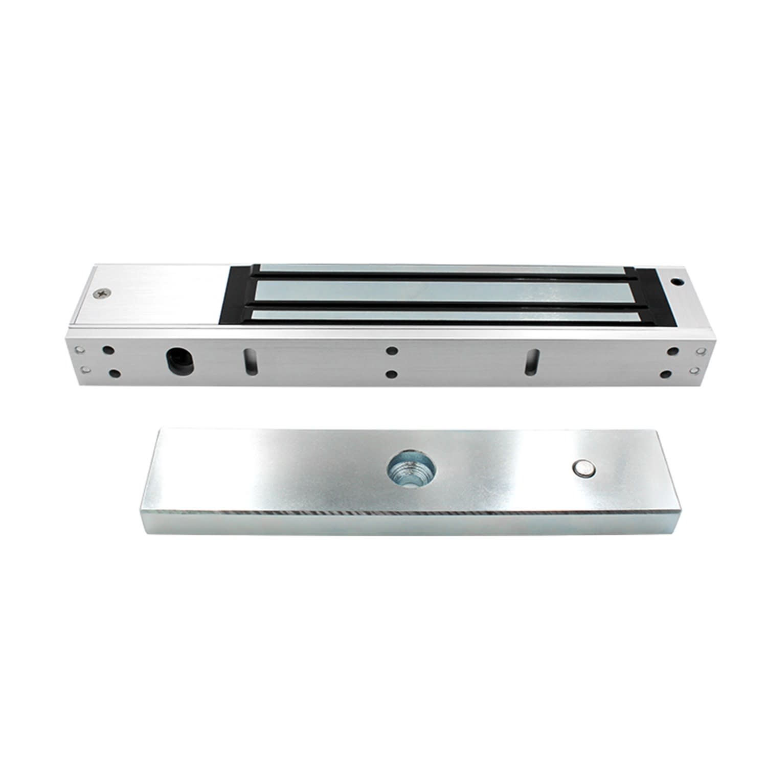 Ventouse électromagnétique 300 Kg pose en applique • Usage intérieur • Intégrée dans un boitier en aluminium • LED de présence tension • Avec contre-plaque en acier zingué • Bi-tensions 12/24 Vcc • 12 Vcc 0.45A - 24 Vcc 0.29A