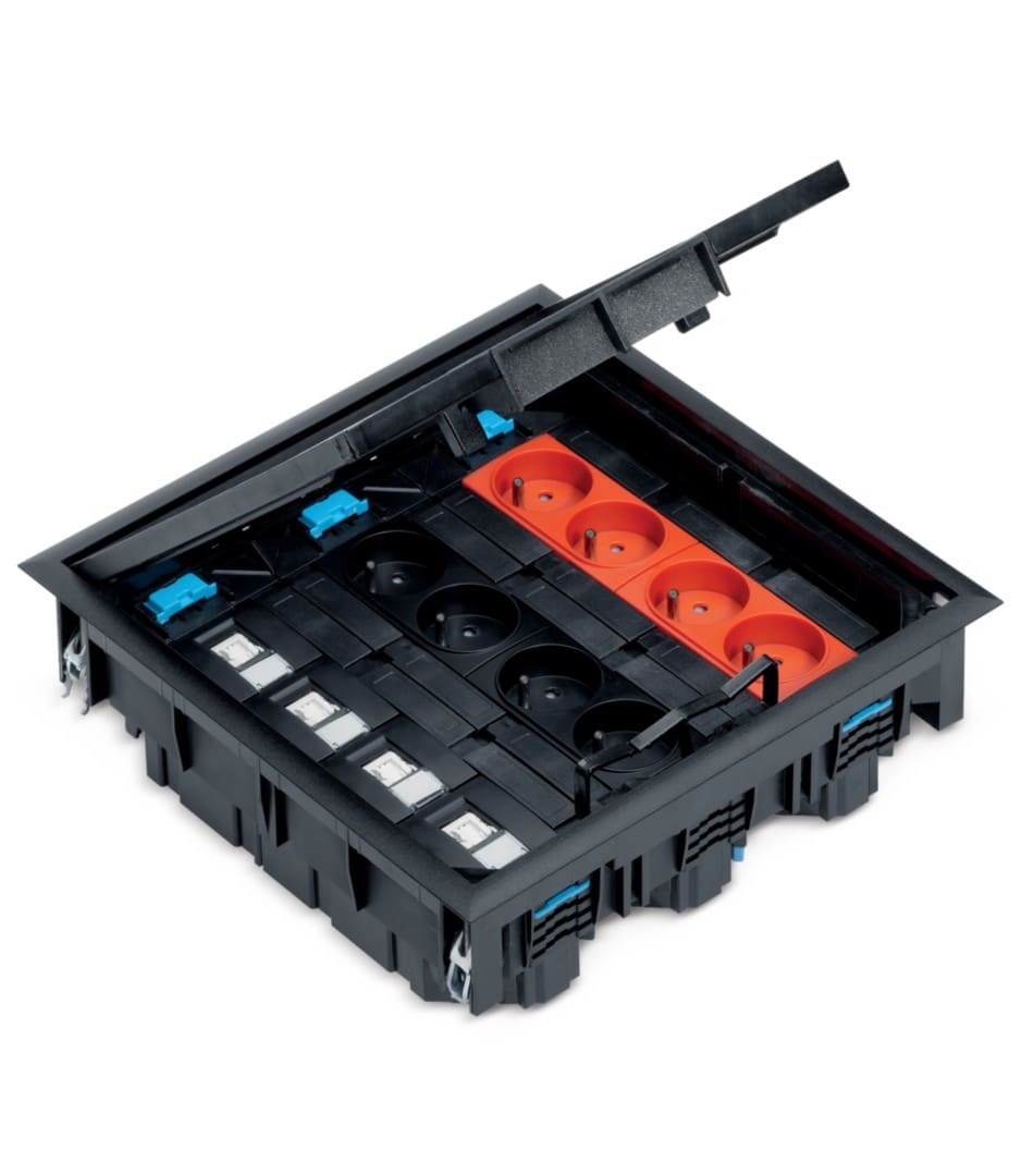 Le système de boîtes de sol permet de réaliser des installations au plus près des postes de travail en faux-plancher ou en sol béton. Elles sont munies d'un système anti-pincement protégeant les câbles d'alimentations.