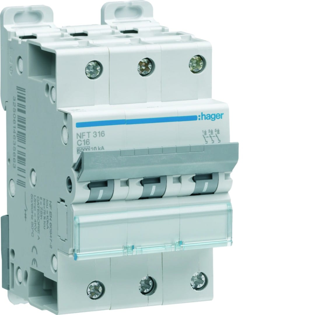Hager - Disjoncteur 16A 3P 6-10kA Courbe C 3module - NFT316