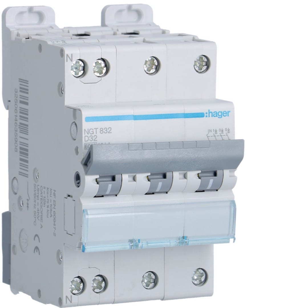 Hager - Disjoncteur 32A 3P+N 6-10kA Courbe D 3module - NGT832