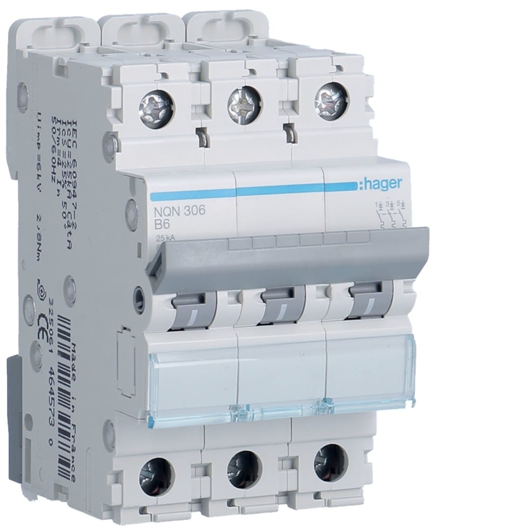 Hager - Disjoncteur 6A 3P 25kA Courbe B 3modules - NQN306