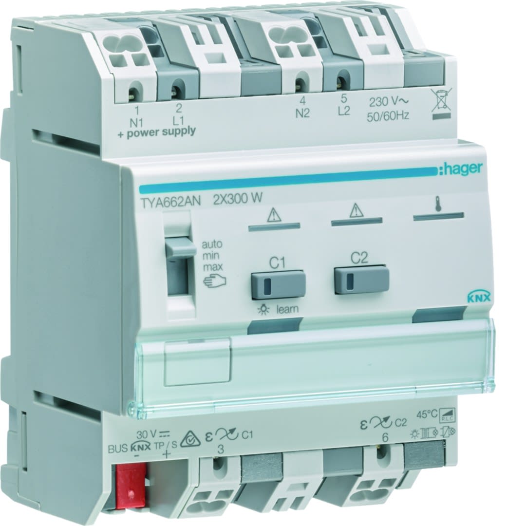 Hager - Module KNX 2 sorties variation éclairage 300W / voie, parallélisable / ETS - TYA662AN