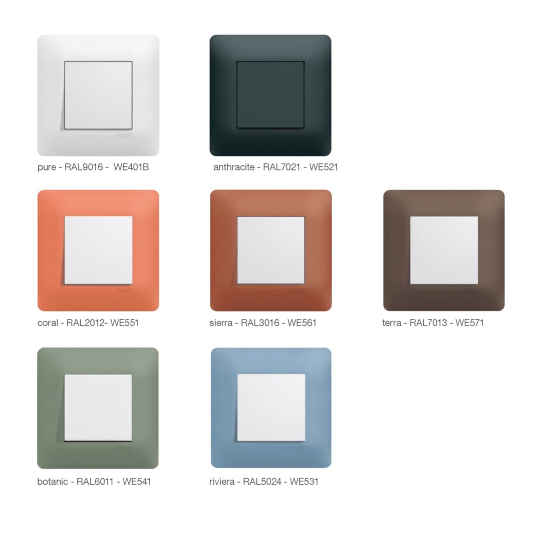 2 références pour composer un produit complet : 1 mécanisme disponible en 2 couleurs, blanc et titane, et 8 couleurs de plaque de finition, blanc, noir, titane, graphite, sisal, bronze, bleu émail et rouge émail.