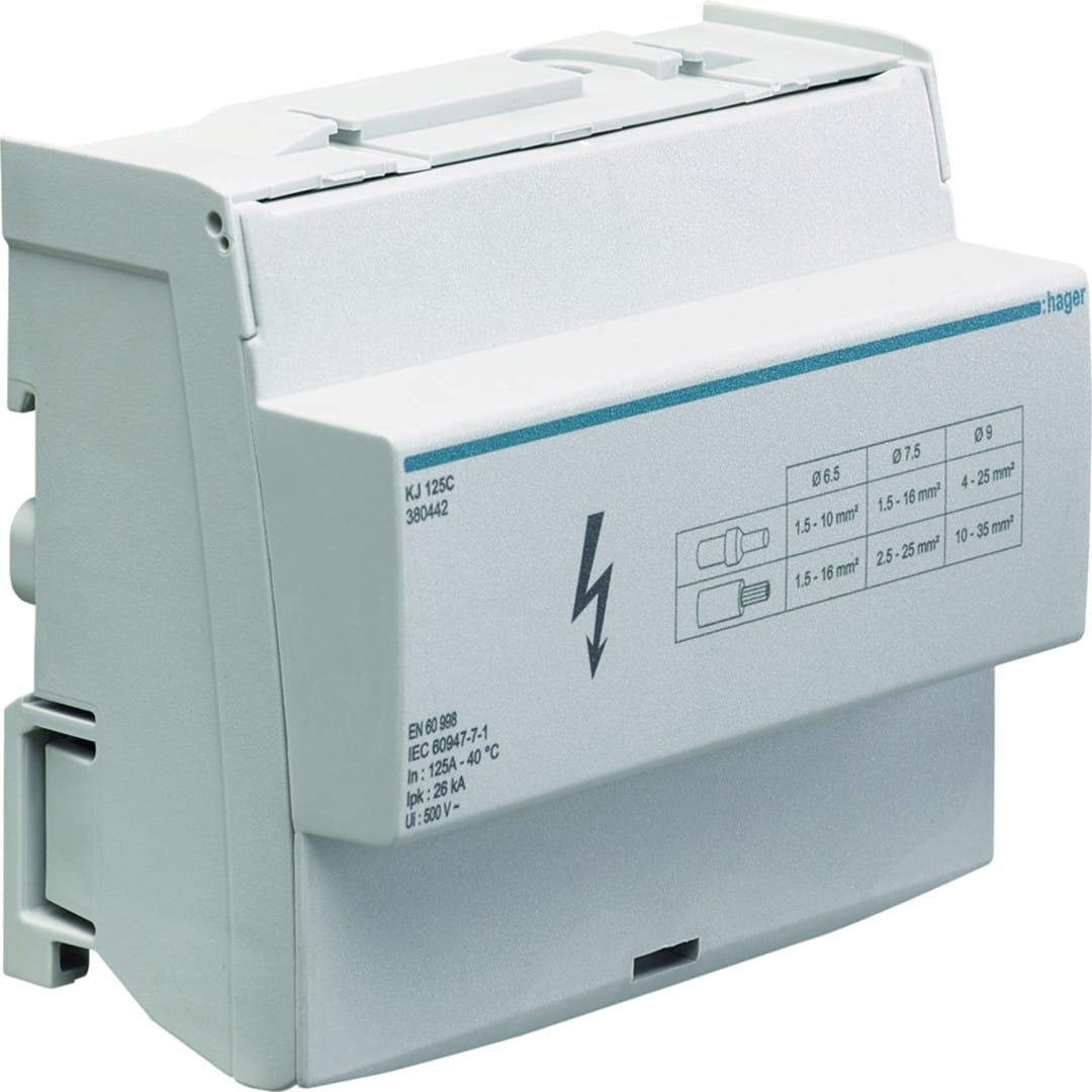 Hager - Répartiteur 125A, tétrapolaire, 1x 10-35mm²/ 7x 4-25² / 4x 2,5-16² par phase - KJ125C