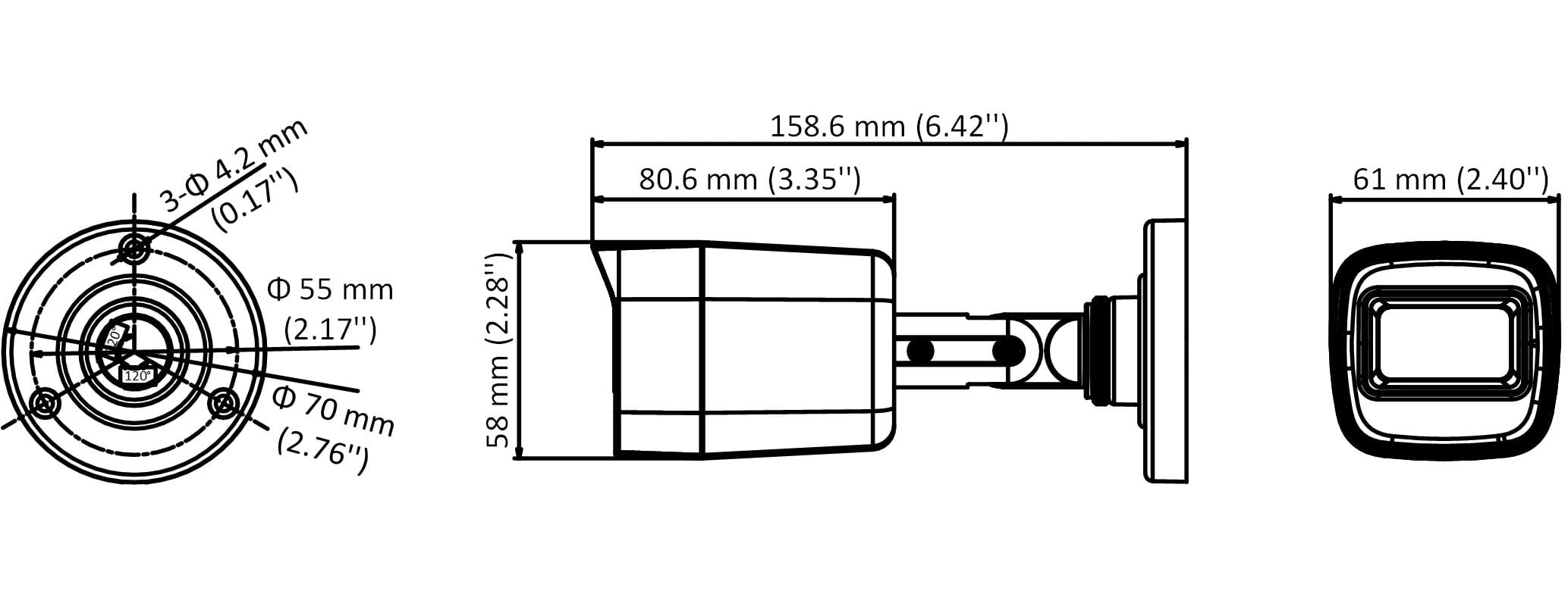 5MP@20fps, 4MP@25fps(P)/30fps(N)(Default), EXIR, 30m IR, Outdoor EXIR Bullet, ICR, 0.01 Lux/F1.2, 12 VDC, Smart IR, DNR, Built-in Mic,Audio up Coaxial(Only TVI), IP67,2.8mm Lens,Support TVI/AHDVIVBS video signal output