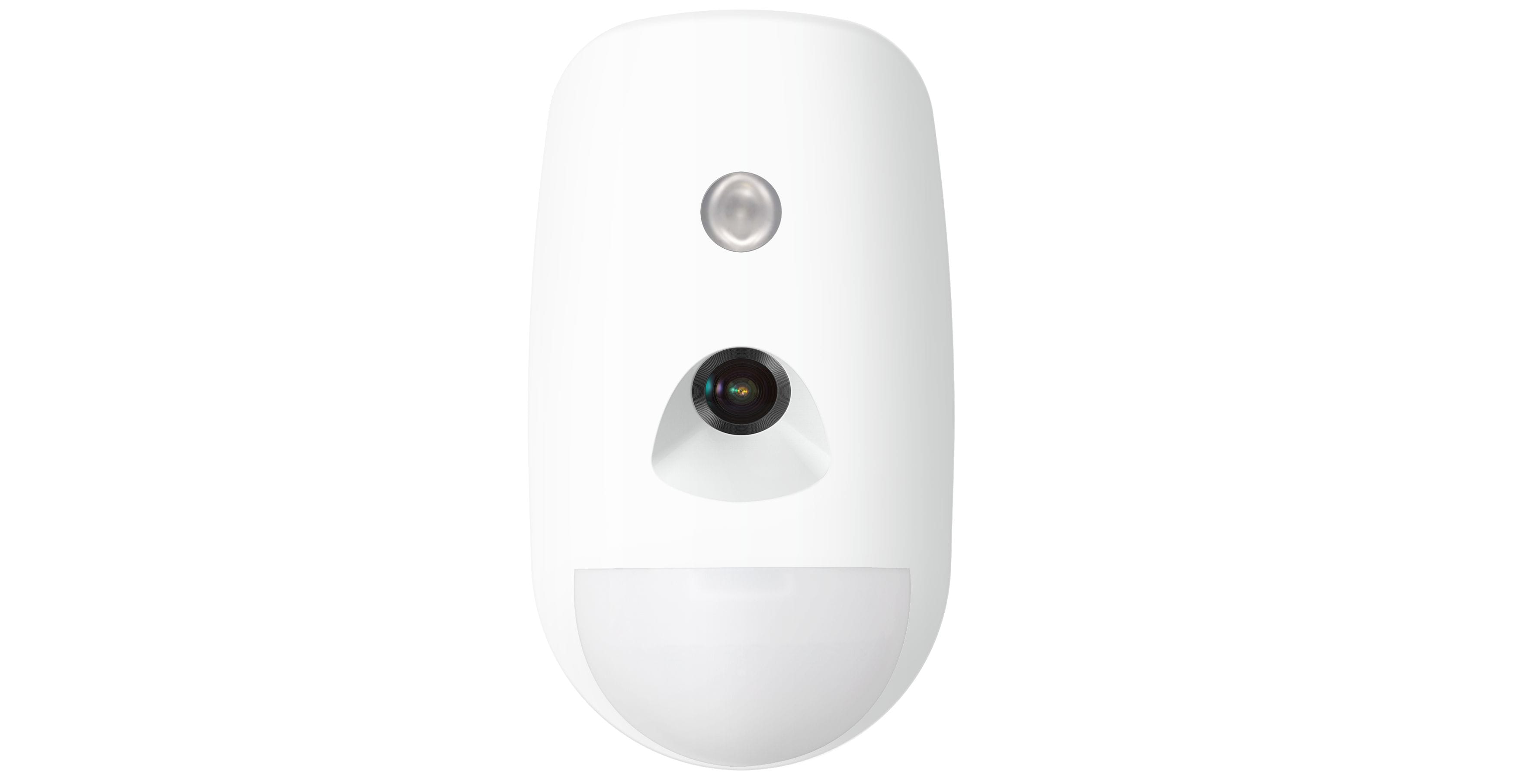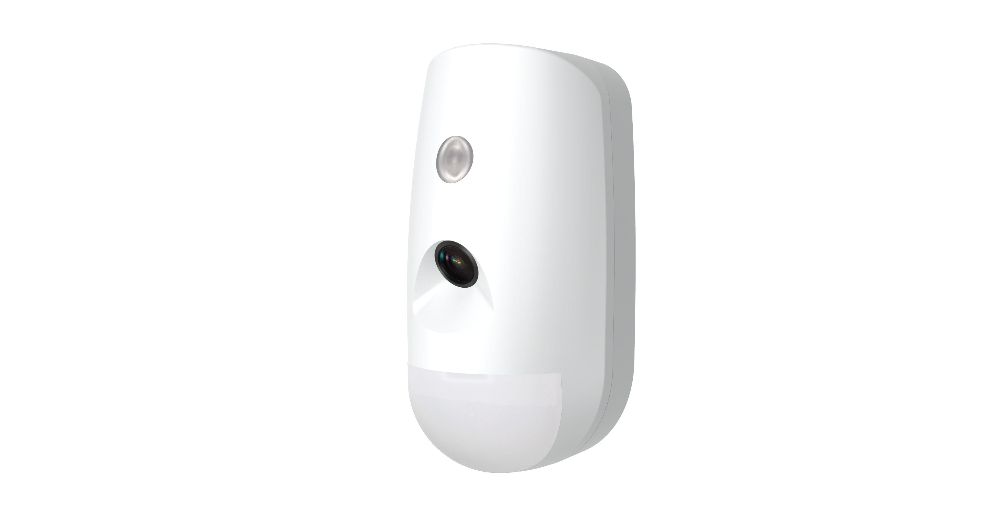 Détecteur PIR avec caméra intégrée capturant des images lors d’alertes, couverture 12 m / 90° avec immunité animaux 24 kg, images IR de nuit, contrôle environnemental SEC pour stabilité, configuration et gestion via application mobile.