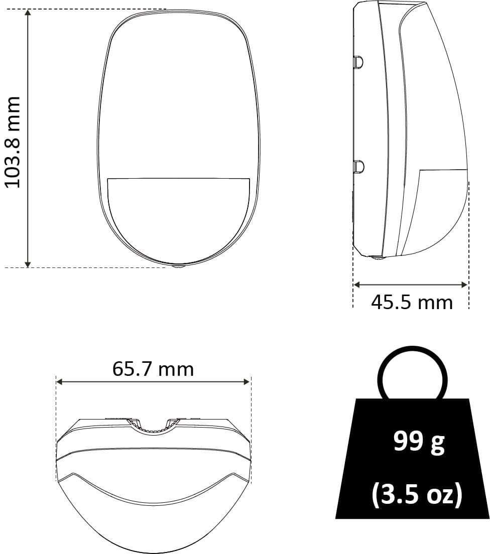 Détecteur 12 m / 85,9°, immunité animaux 30 kg, sensibilité automatique, compensation thermique, 52 zones optiques 3D avec zone de reptation, résistances EOL sélectionnables, optiques anti-insectes, micro-ondes 24 GHz, anti-fausses alertes.