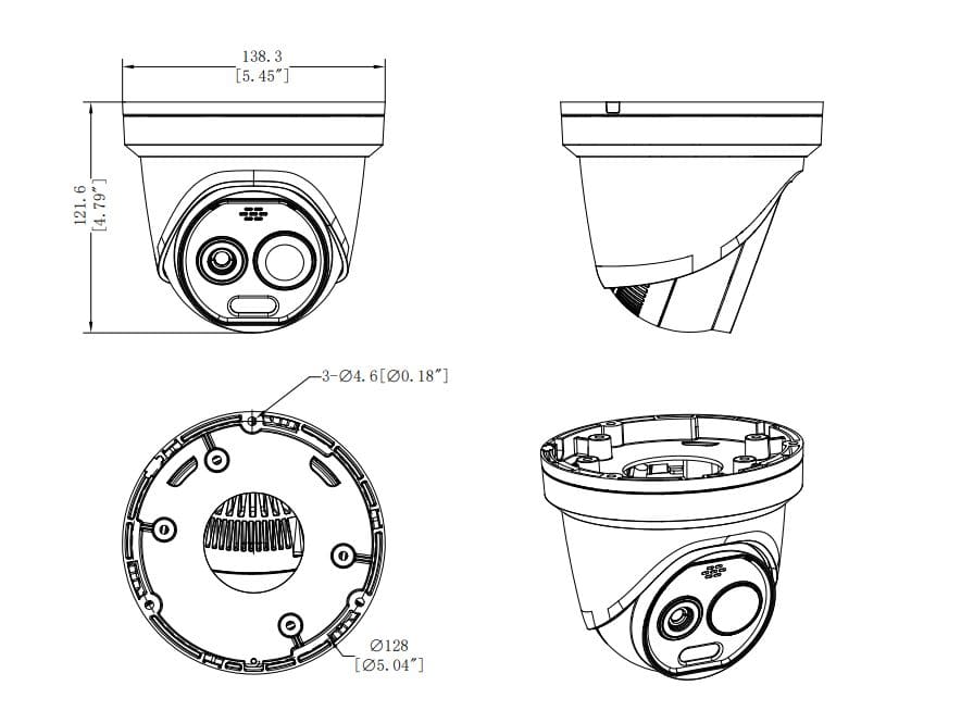 Caméra bi-spectre 5MP + thermique 256×192, FOV 90°, NETD <25mK, alarme sonore et lumineuse, détection intelligente, mesure température -20~150°C (±8°C), IP67, -40°C à +65°C, PoE, éclairage hybride. IA Guanlan à grande échelle
