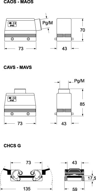 Capot haut profil 4 pivots, sortie verticale entrée de câble M32 - gabarit 57.27 - série CEM