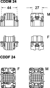 Insert femelle 24 pôles + Terre 10A/250V, raccordement à sertir gabarit 44.27 - série CDD