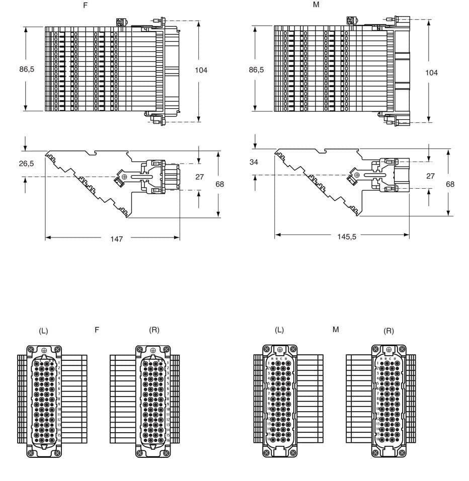 Insert bornier mâle 64P+T 10A 250V, raccordement à lame de pression, montage droite gabarit 104.27