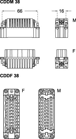 Insert mâle 38 pôles + Terre 10A/250V, raccordement à sertir - gabarit 66.16 - série CDD