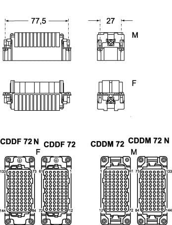 Insert mâle 72 pôles + Terre 10A/250V numéroté de 73 à 144, raccordement à sertir - gabarit 77.27 - série CDD