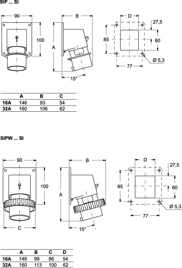 Socle de connecteurs encastrée 3 Pôles + Neutre + Terre 380V IP44 32A avec inversion de phases