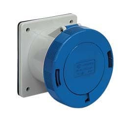 Prise de courant femelle encastrée droit 220V 63A 2P+T, position Terre 6h (bleu), raccordement à visser, degré IP67