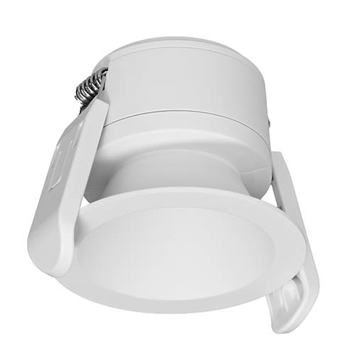 Spot encastré rond fixe 4 en 1. 2700K, 3000K, 4000K ou 6000K au choix via un interrupteur sur le convertisseur. Fixation par ressorts. Peut être recouvert par un isolant déroulé ou soufflé. Convertisseur dimmable déporté fourni.