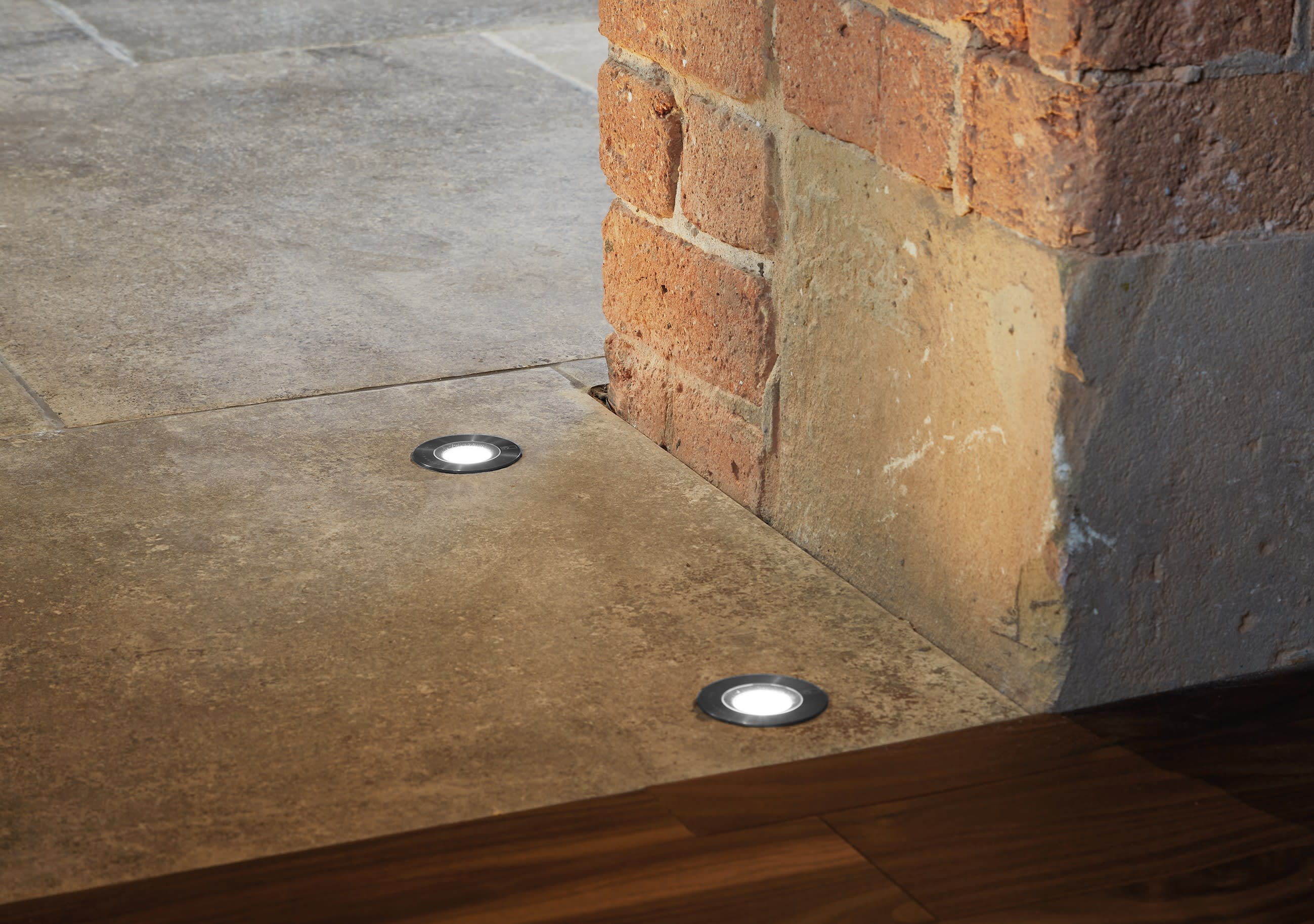 Gamme d'encastrés de sol de 1W immergeables jusqu'à 9m de profondeur disponibles en sept couleurs LED en version ronde ou carrée Faible profondeur pour une installation facile dans des terrasses ou pour l'éclairage des allées Disponible en inox 316 pour une installation dans les zones côtières ou en laiton antique pour des résidences d'époque Disponible en version basse luminance avec un verre opaque pour le balisage