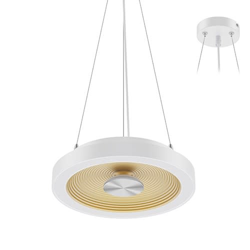 Suspension décorative. Eclairage direct diffus via l’anneau externe et indirect via le réflecteur au design ondulé. Livrée avec câbles de suspension (réglables 2m max), base ronde et câble d'alimentation blancs. Dimmable.