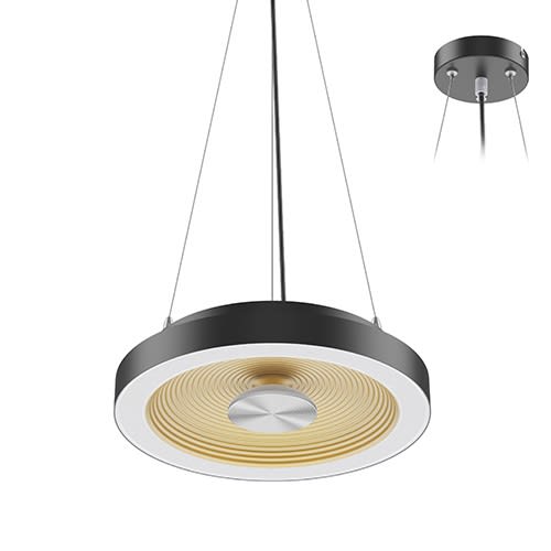 Suspension décorative.Eclairage direct diffus via l’anneau externe et indirect via le réflecteur au design ondulé.Livrée avec câbles de suspension (réglables 2m max), base ronde et câble d'alimentation noirs.Dimmable.