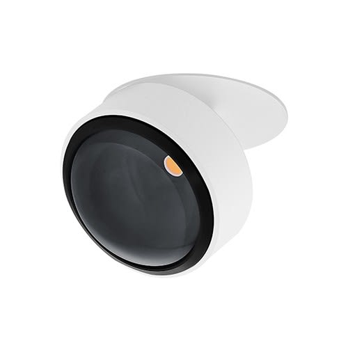 Downlight semi-encastré rond orientable. Faisceau lumineux précisément dessiné grâce à une lentille en verre de haute qualité. Fixation par ressorts. Convertisseur non dimmable déporté fourni.