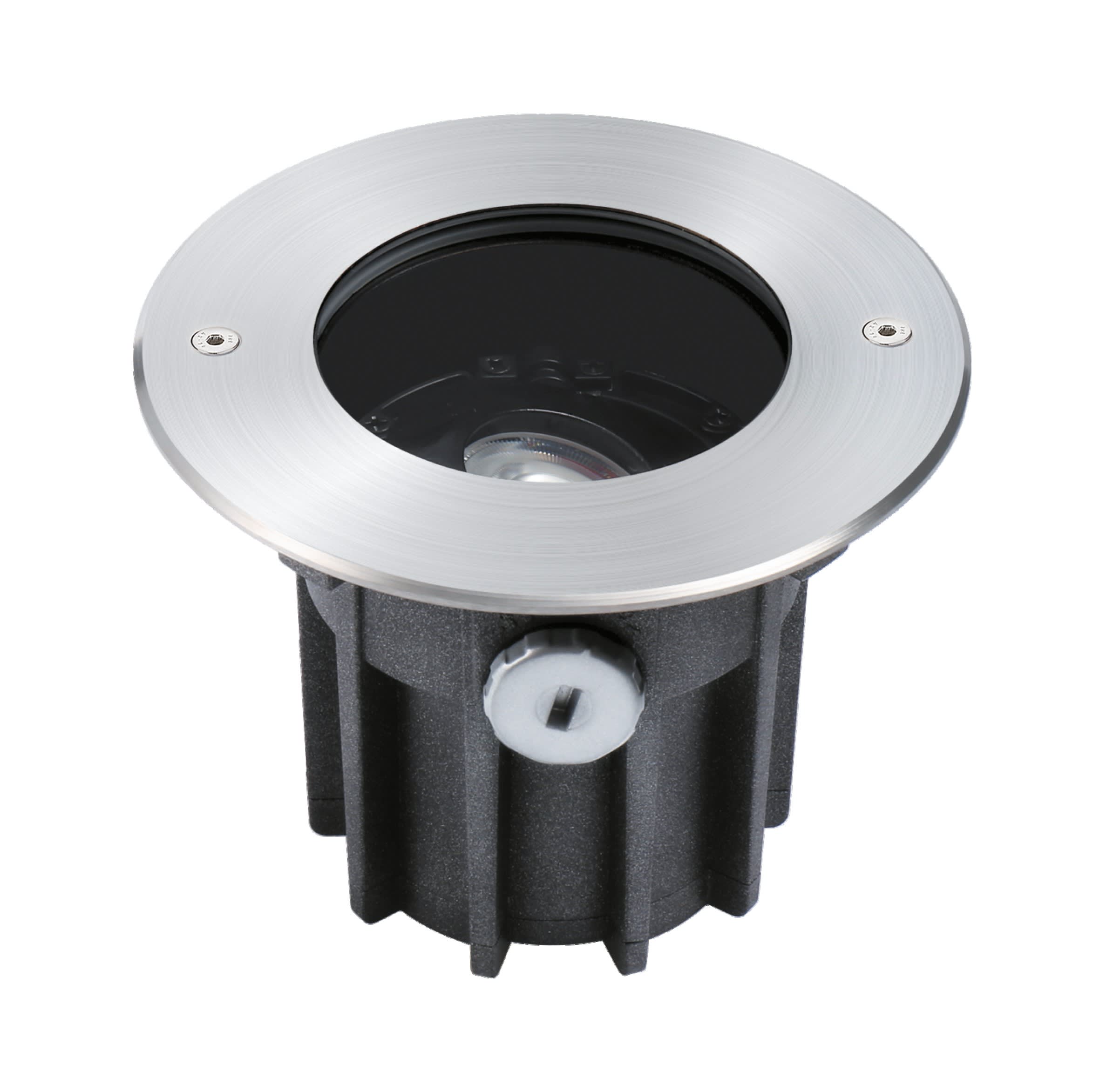 Encastré de sol rond avec source orientable. Diffuseur en verre clair. Carrossable résistance 2000kg. Inox 316 pour les zones côtières. Pot d'encastrement et 1m de câble H05RN-F fournis. Convertisseur dimmable intégré dans l'appareil.