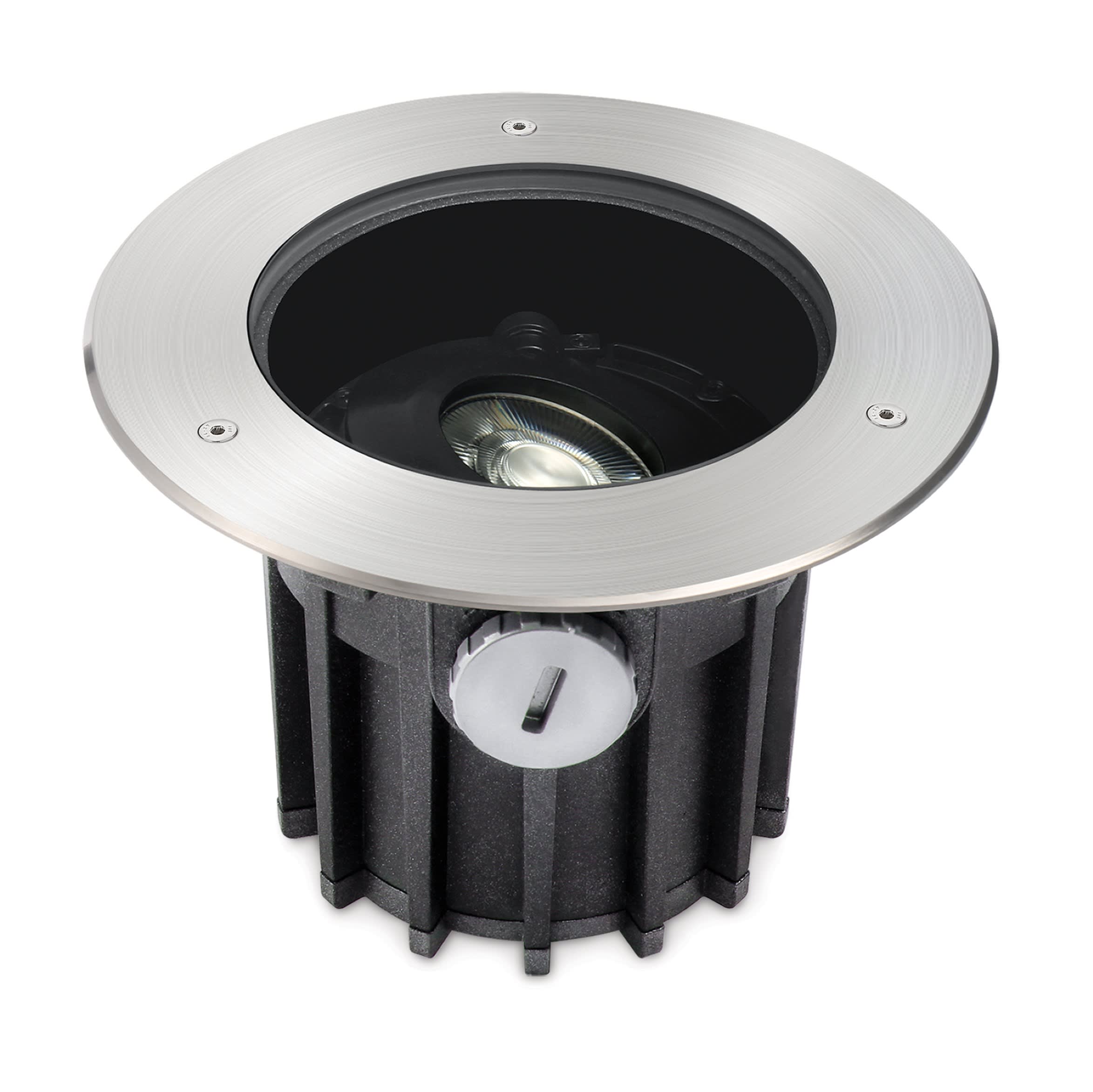 Encastré de sol rond avec source orientable. Diffuseur en verre clair. Carrossable résistance 2000kg. Inox 316 pour les zones côtières. Pot d'encastrement et 1m de câble H05RN-F fournis. Convertisseur dimmable intégré dans l'appareil.