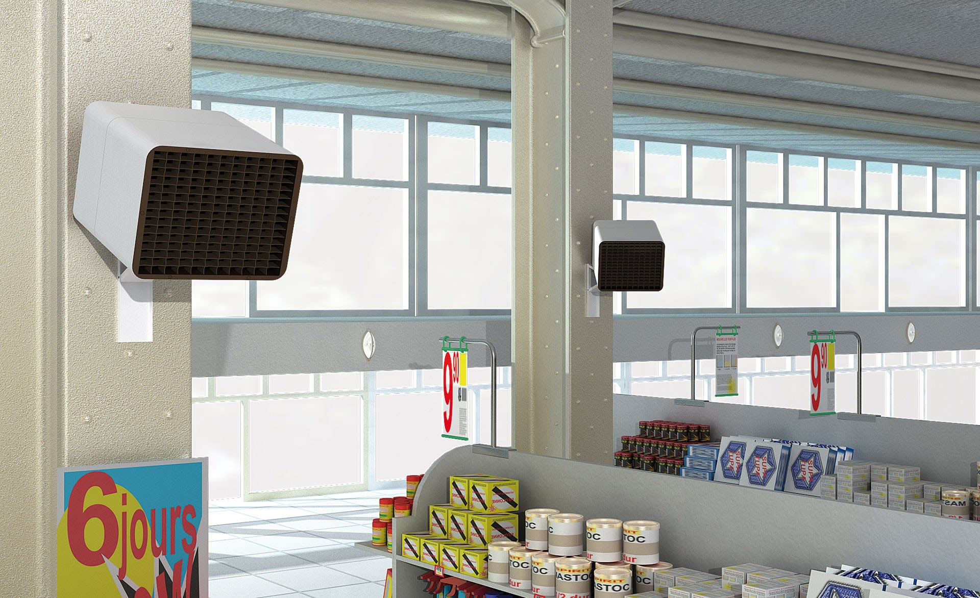 Aérothermes Mobiles/Fixes-4500/3000 W-Fixation murale comprise-Un flux d’air longue portée directionnel et homogène pour plus de confort.