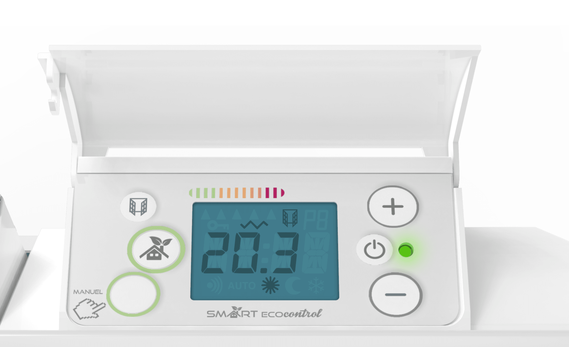 Le boîtier de commande est simple d'utilisation : touche à mémoire de confort et fonctions à économies d'énergie, tel que la détection de fenêtreouverte. l'indicateur de consommation et un abaissement automatique de température en cas de détection d'absence.