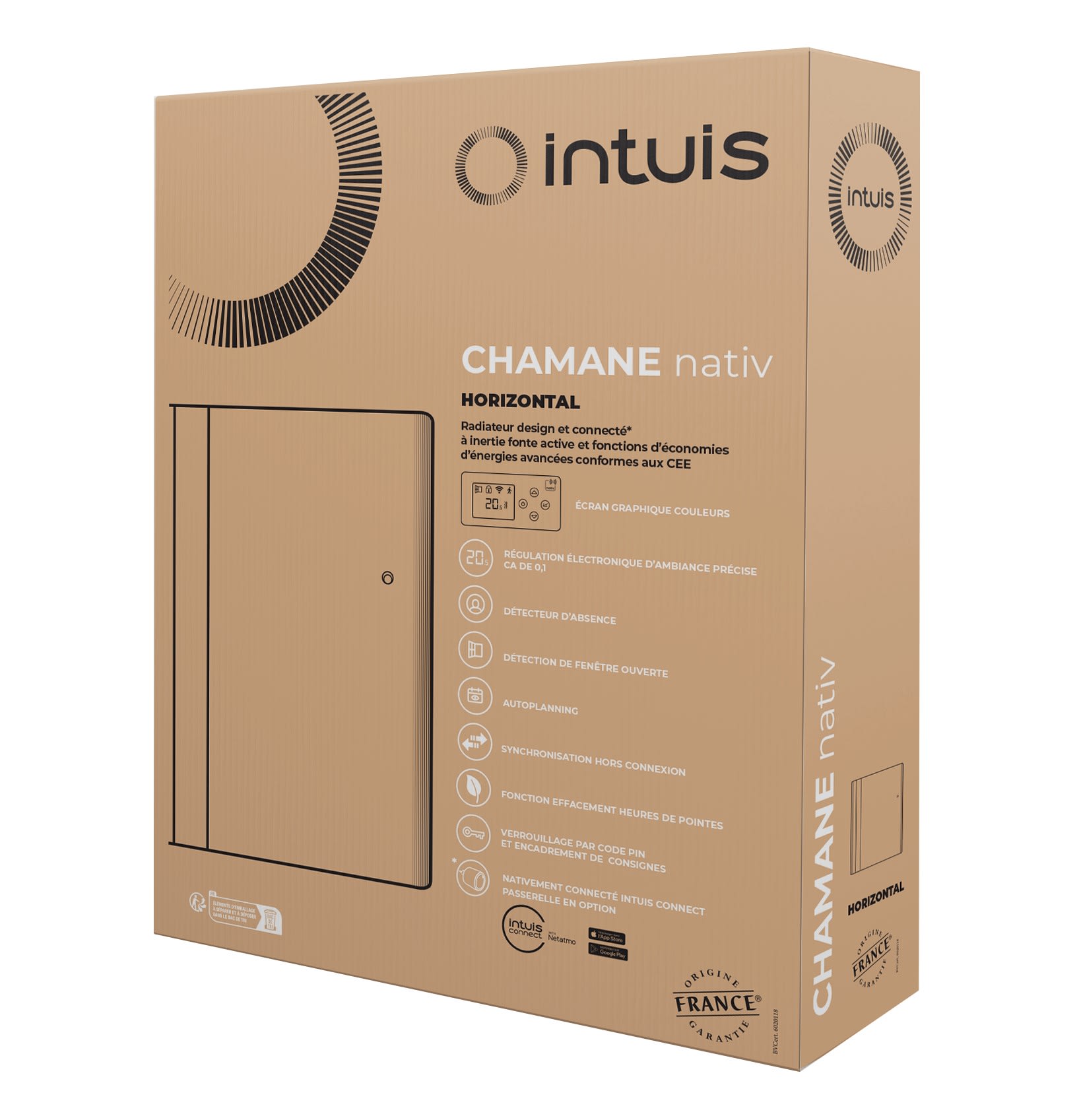 Une ligne de radiateur à inertie fonte active au design épuré. Peu épais, ses formes courbes épousent le mur en toute discrétion. la gamme se décline en 3 formats horizontal, vertical et plinthe et en 2 couleurs blanc satiné lisse et anthracite. Son bloc de fonte active avec élément chauffant 100% moulé ** propose un parfait compromis entre inertie et réactivité, pour une sensation de chaleur rapide, permanente et bien répartie dans la pièce. CHAMANE nativ présente les fonctionnalités d’économies d’énergie les plus avancées recommandées dans le cadre des CEE et des rénovations DPE. Détection de présence, planning auto adaptatif . Certification NF performance 3 étoiles oeil. Nativement connecté à l'application intuis connect, il propose des fonctions intelligentes ,accessibles même hors connexion, pour une 'utilisation raisonnée de l'électricité,: synchronisation entre appareil set auto effacement des heures de pointes.
