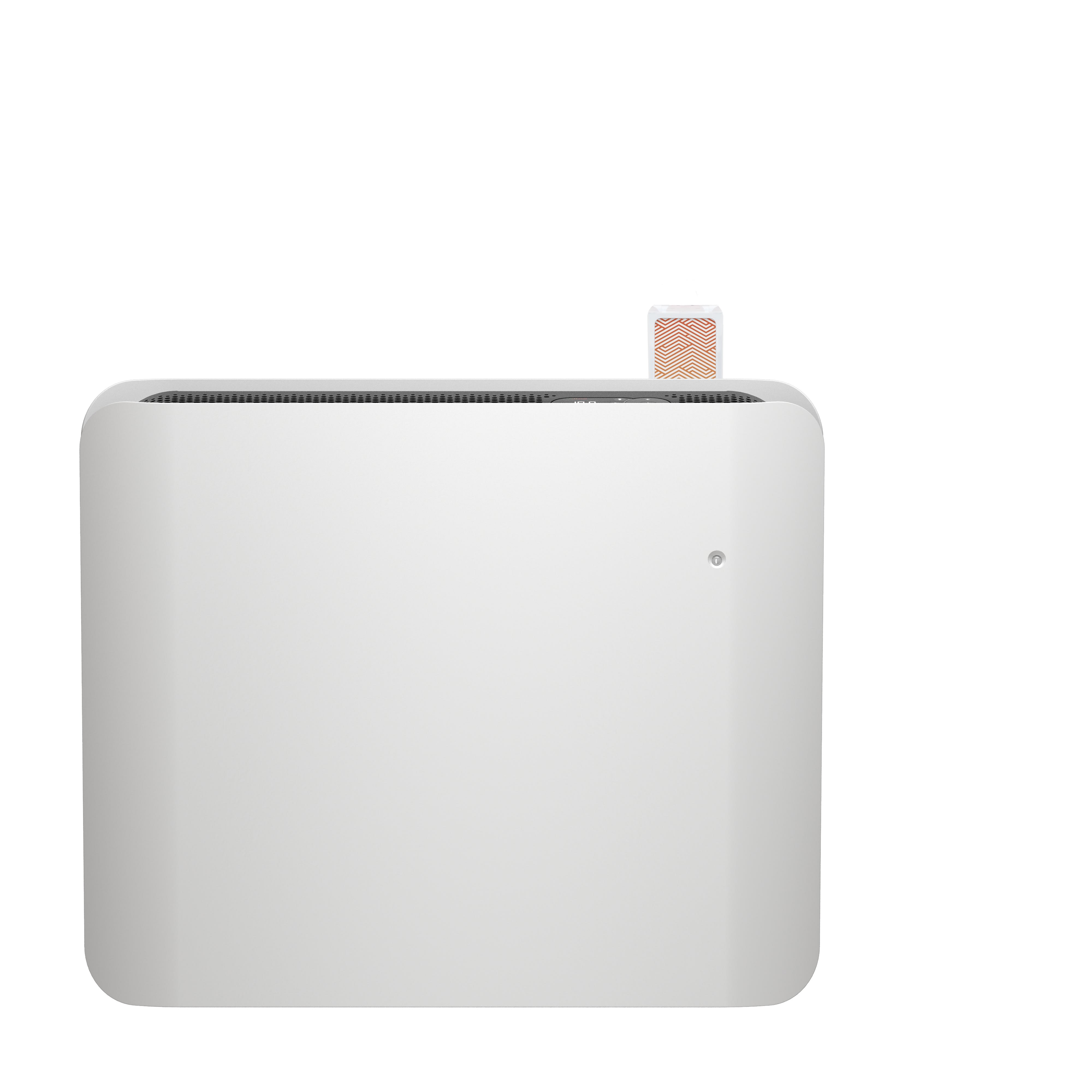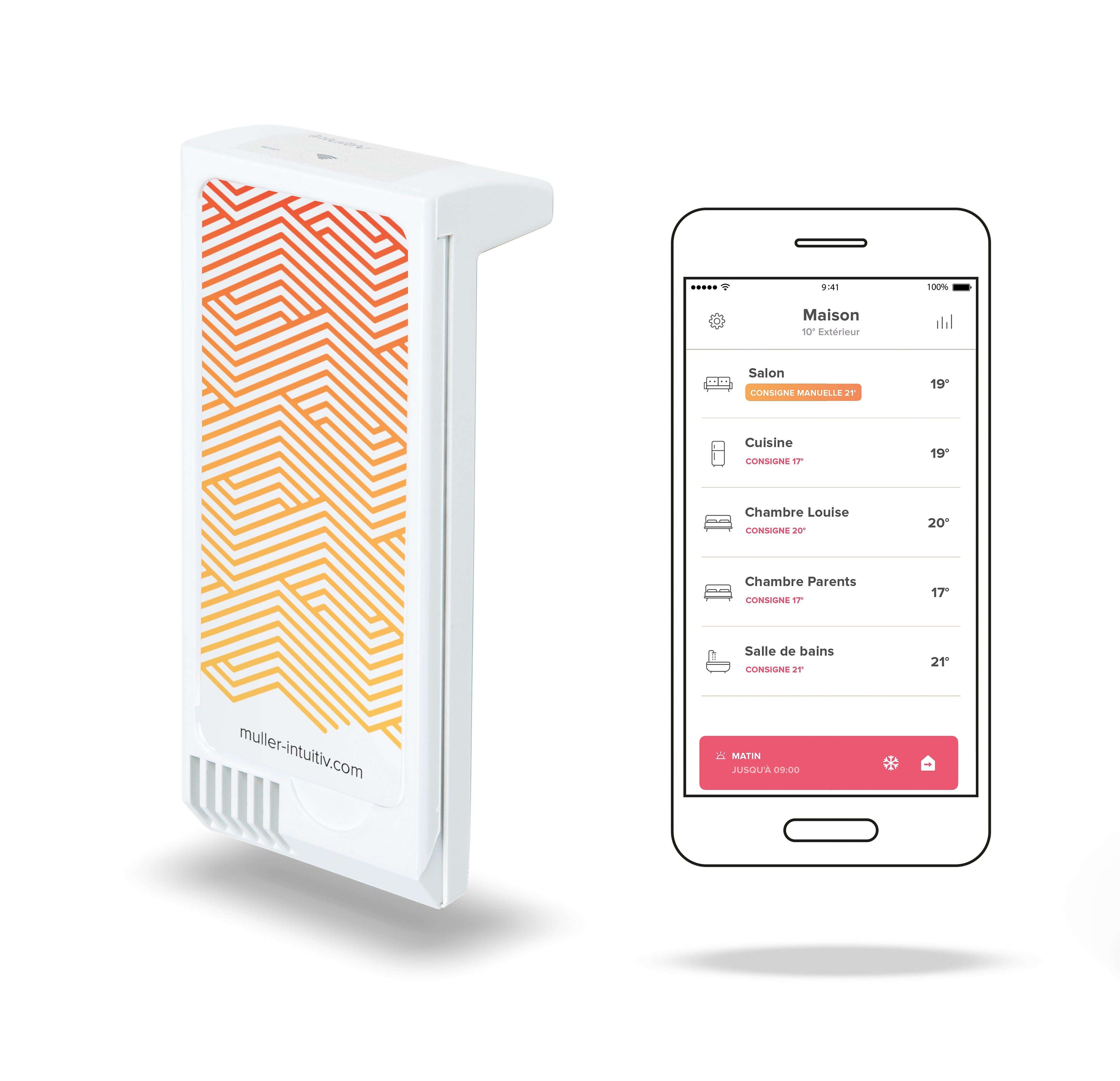 Module de connexion blanc pour radiateurs. Algorithmes d’intelligence thermique. Pilotage par la voix et par smartphone, planning pièce par pièce, suivi des consommations…