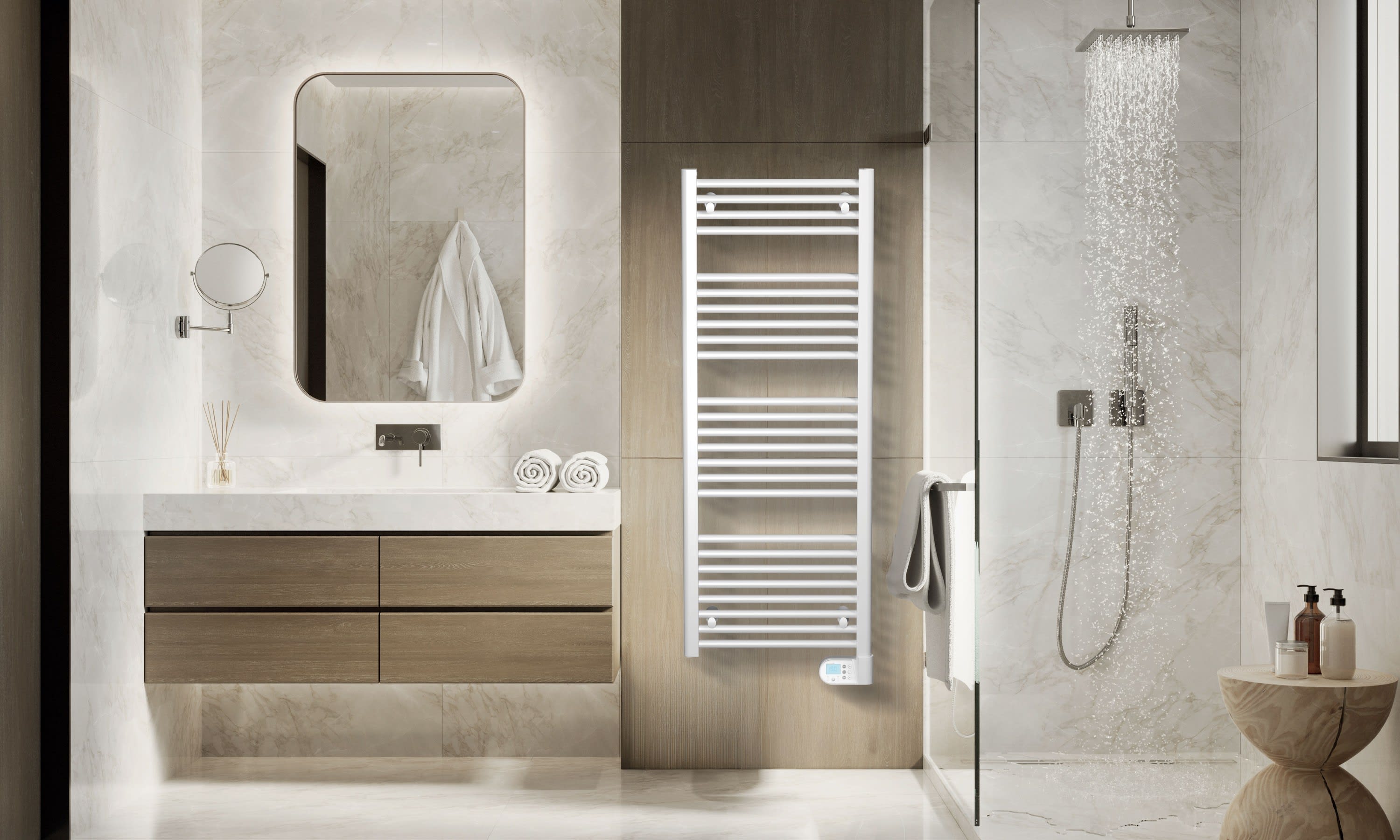 Radiateur sèche-serviettes fluide à tubes ronds. Existe en 2 modèles : normal et étroit Programmation journalière et hebdomadaire intégrée Fonctions à économies d'énergie : détection de présence/absence et de fenêtre ouverte
