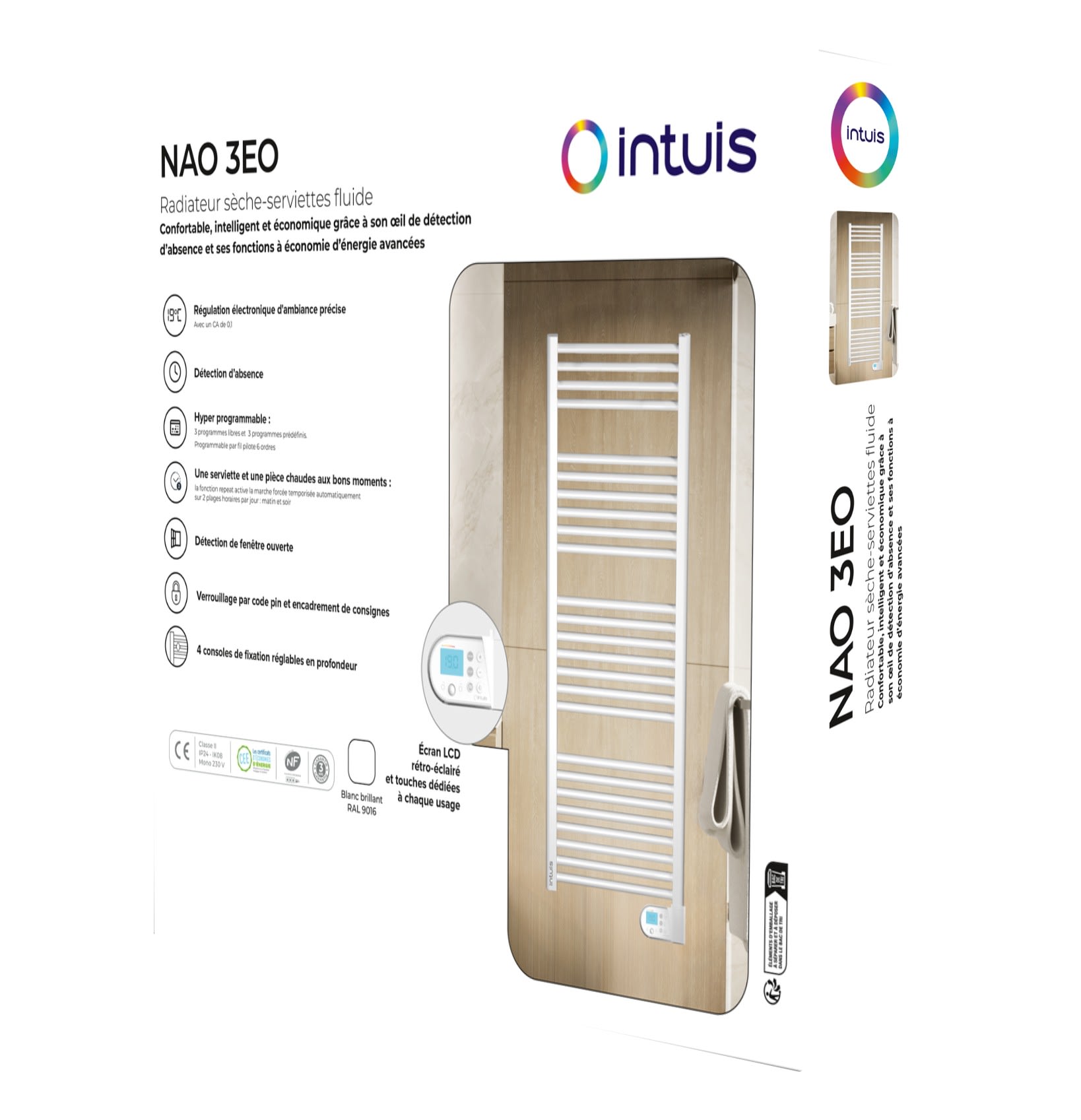 NAO-3EO sèche-serviettes fluide 300W - blanc - largeur 400 mm - NF Performance 3*œil - Fonctions d'économies avancées conformes aux CEE - Détection d'ouverture de fenêtre et de présence.
