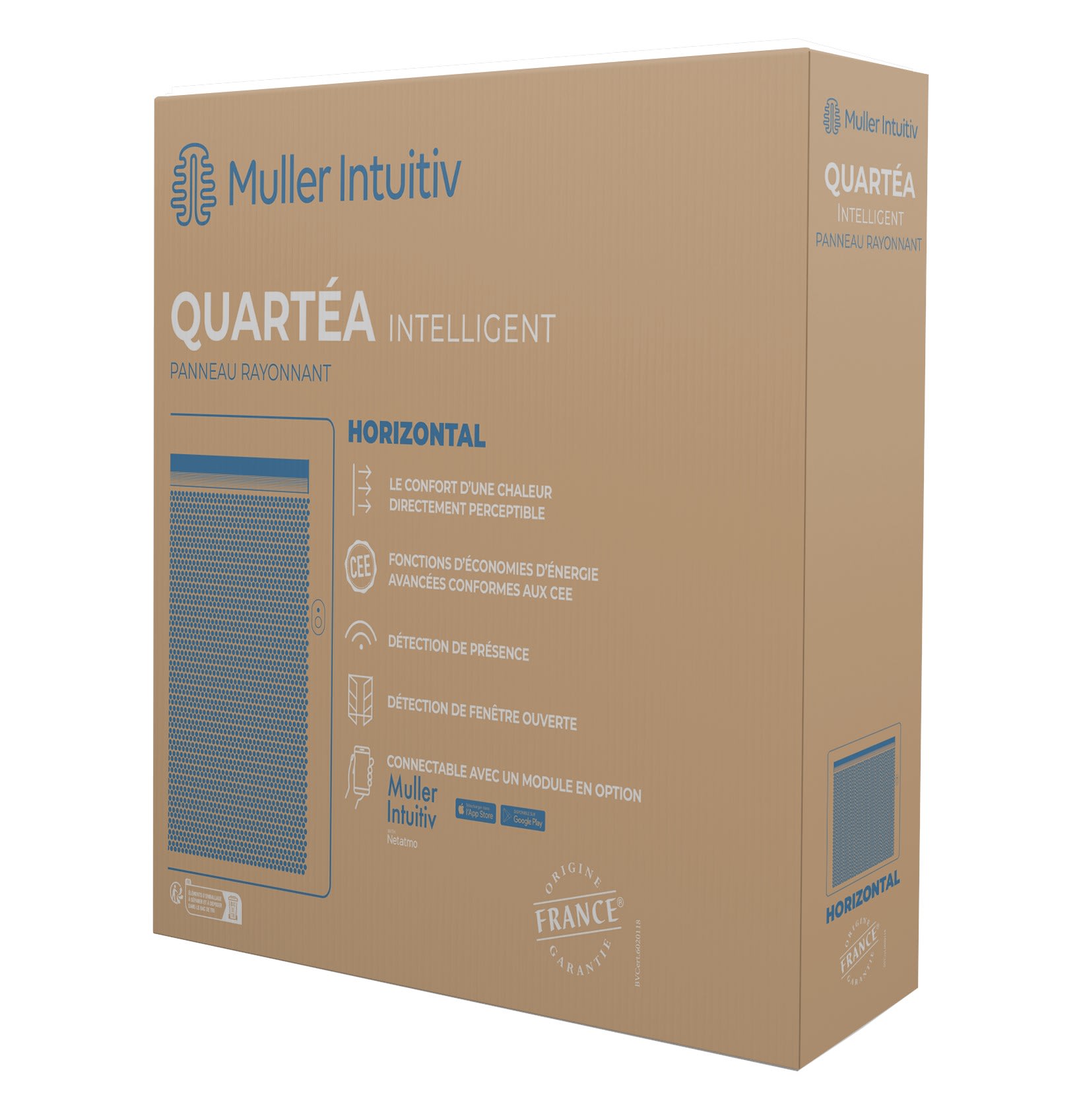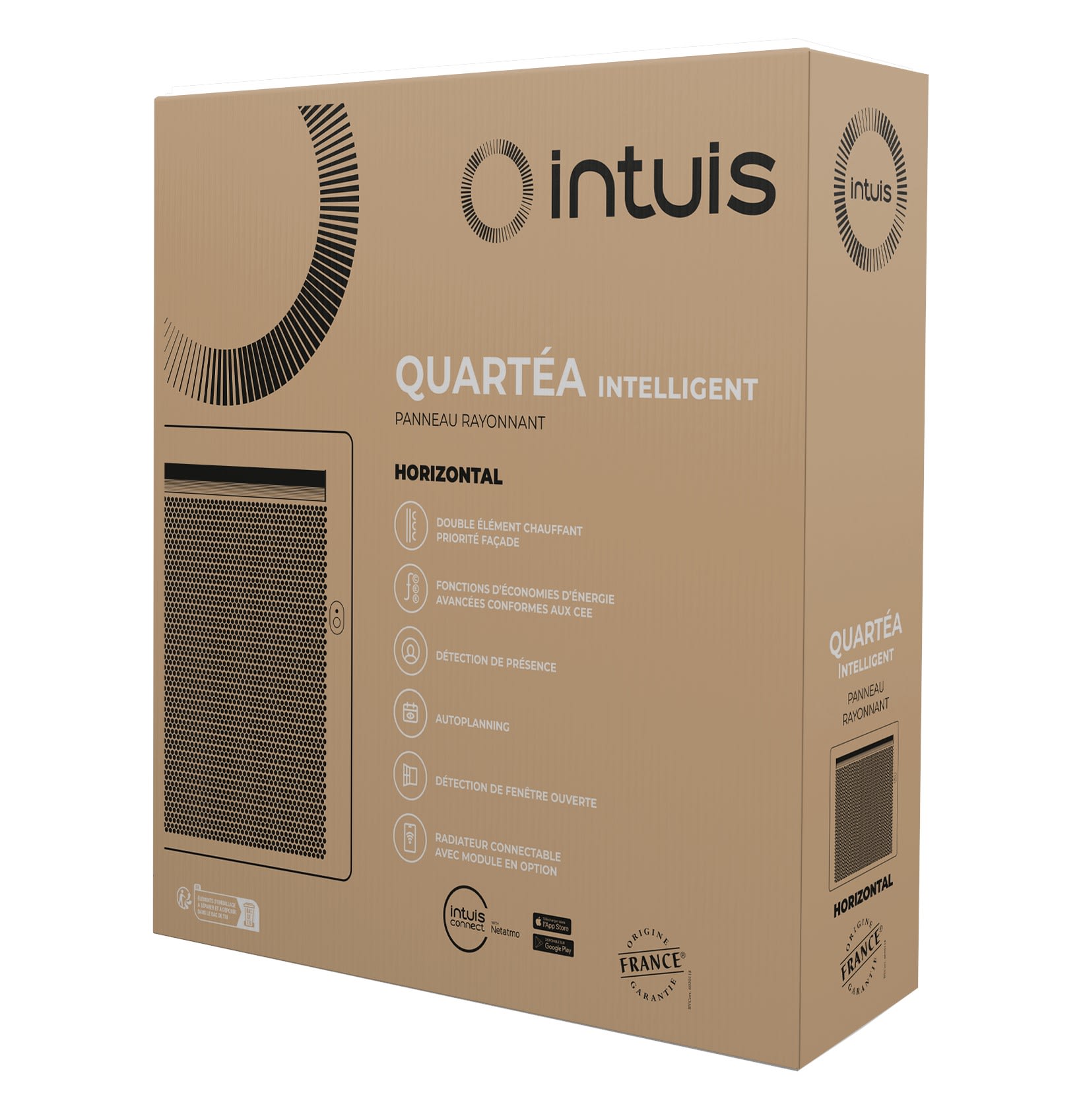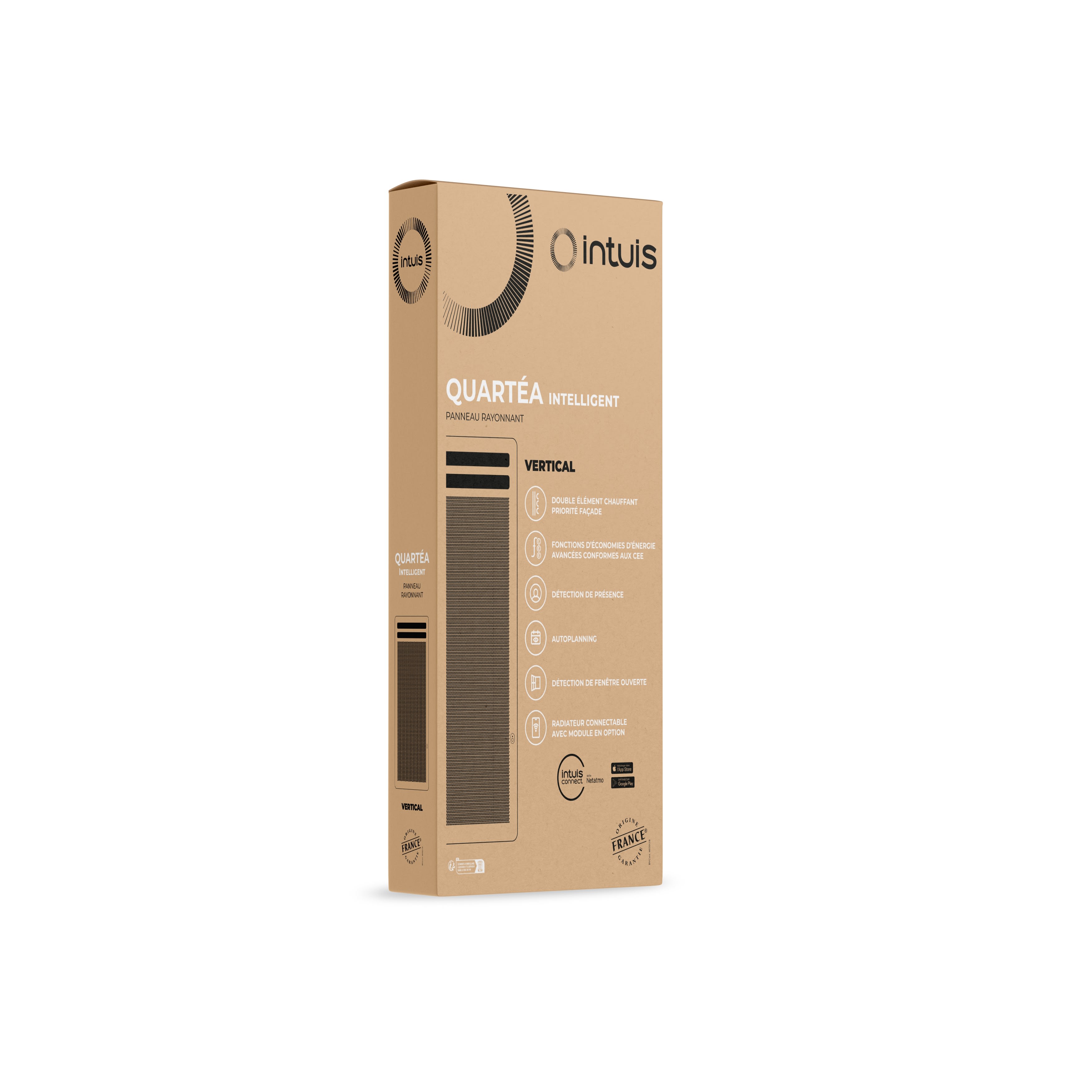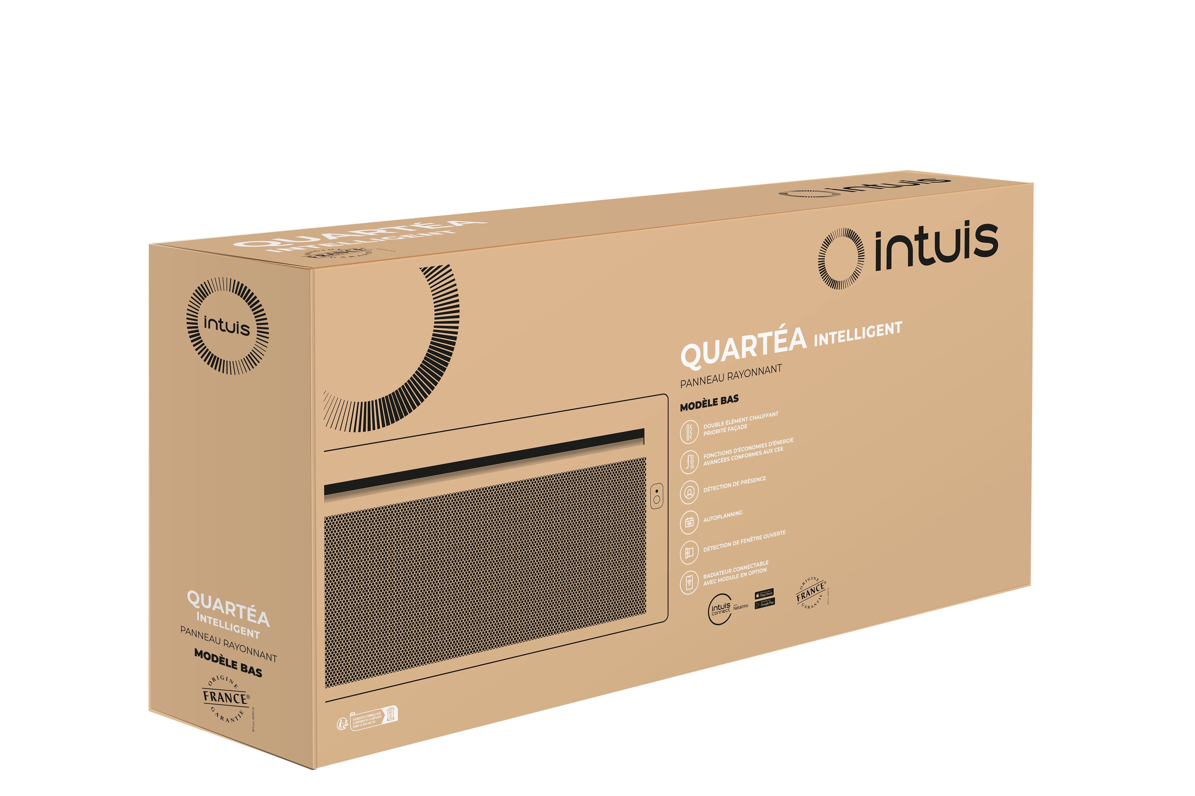 Un design galbé qui optimise la diffusion du rayonnement. Une finition blanc satiné lisse (ral 9033), peu salissante et douce au touché. La gamme de choix dimensionnels la plus complète dans cette catégorie. De 300W à 2000W déclinés en format verticaux, horizontaux et surtout des plinthes rayonnantes de 28,3 cm de hauteur seulement. QUARTEA intelligent est certifié NF performance 3 étoiles oeil** . Cette Certification garantie le plus haut niveau de performance en matière de confort et de fonctions avancées d'économie d'énergie, recommandées dans le cadre des DPE. Une gestion facile des économies d'énergie en mode local ou depuis un smartphone en mode connecté, grâce à l'application intuis connect with Netatmo.*