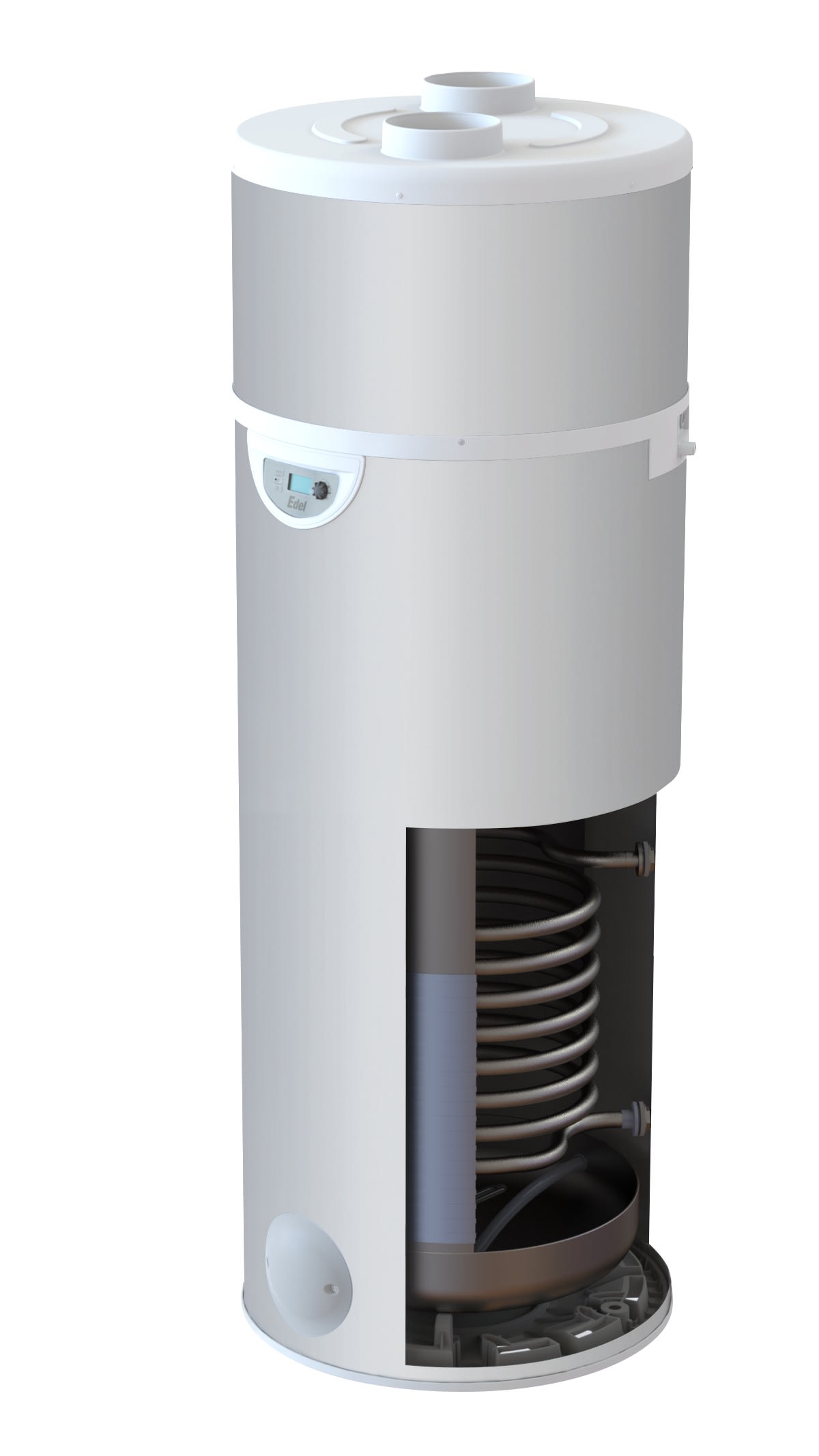 Chauffe-eau thermodynamique EDEL 270 air avec échangeur, sur air, 270L, sol, monobloc, R290 sans HFC, cuve inox, éch. intégré raccordt appoint chaudière, sur air ambiant ou air extérieur par gaines Ø 160 mm, appoint élec 1,2 kW intégré