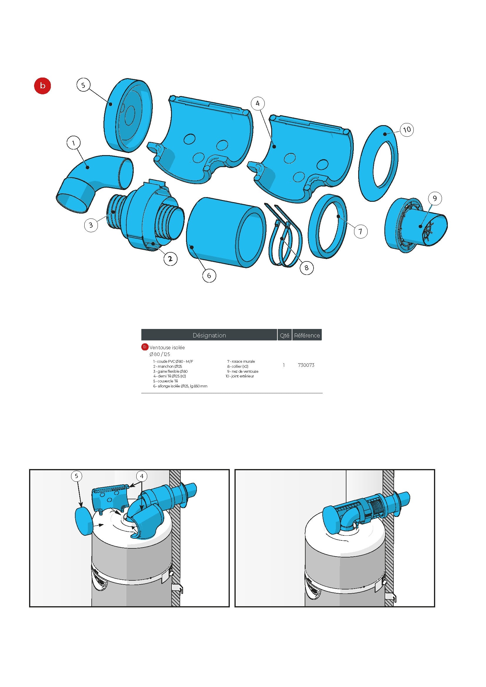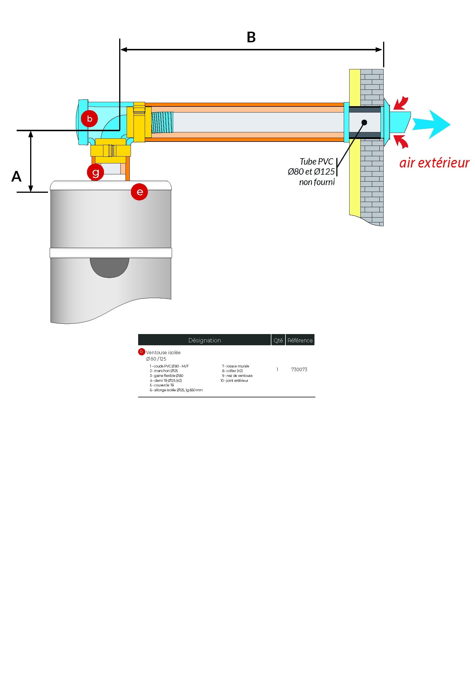 Raccordement aéraulique - ventouse isolée latérale ou verticale - Ø 80/125 mm – longueur 975 mm