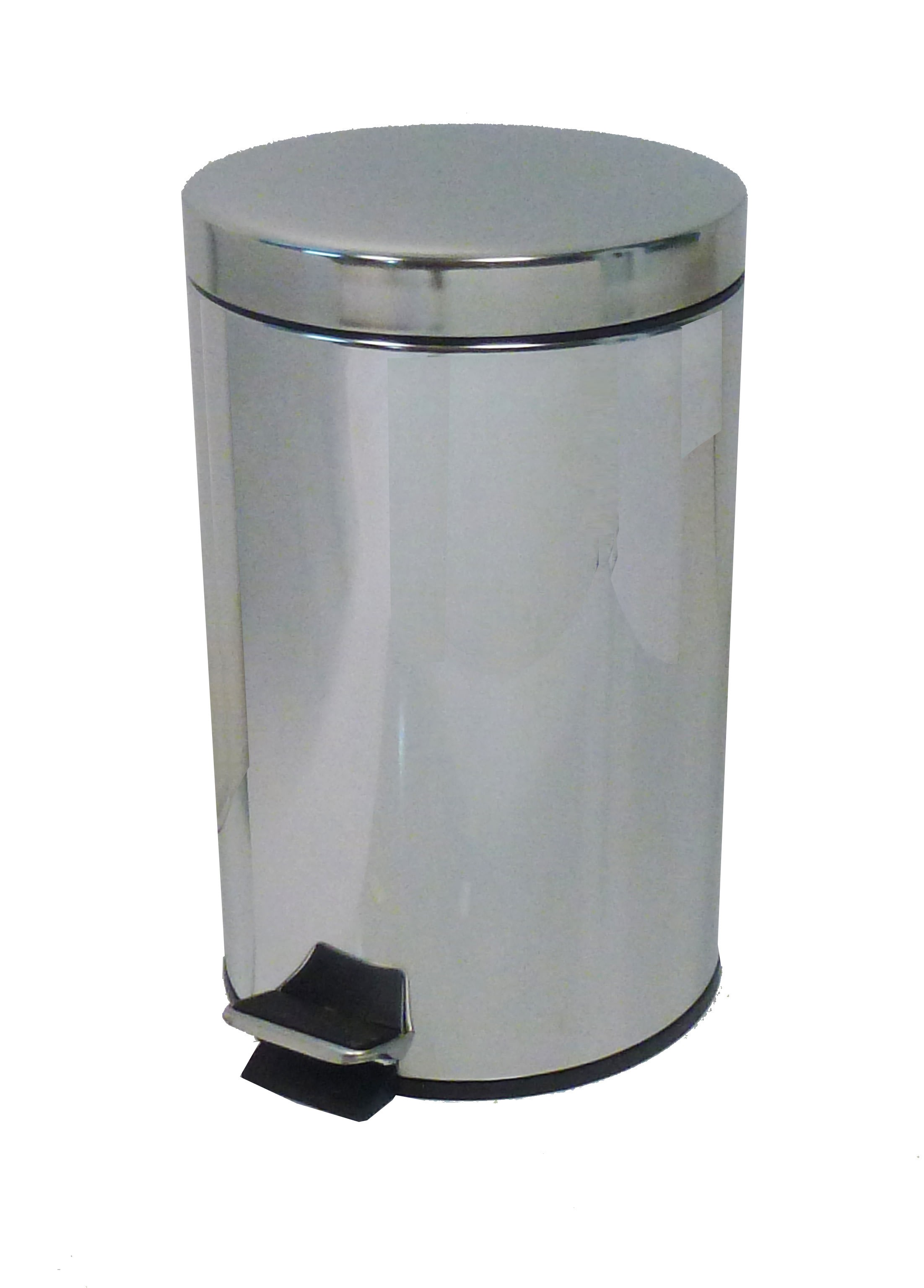 COLLECTEUR à pédale 12L inox miroir. Extérieur en métal et bac intérieur en plastique noir. Protection caoutchouc à la base