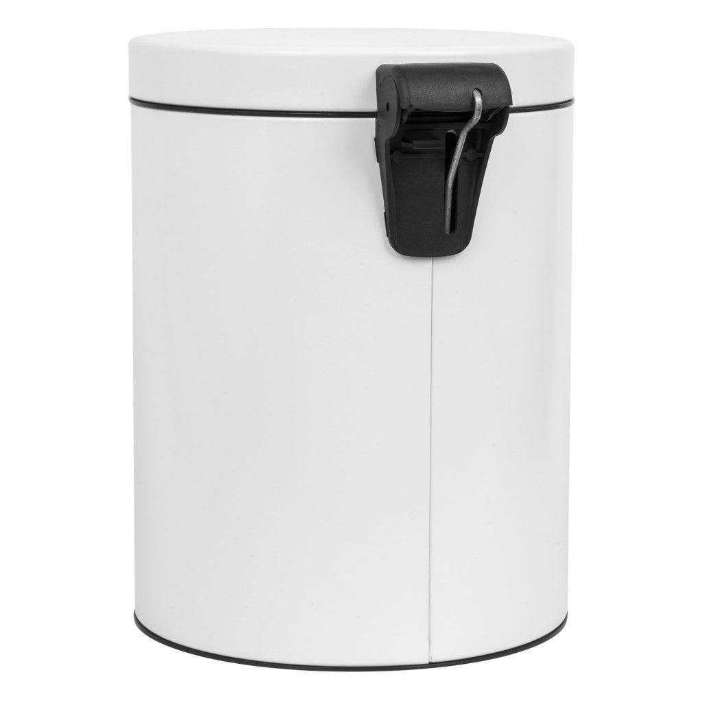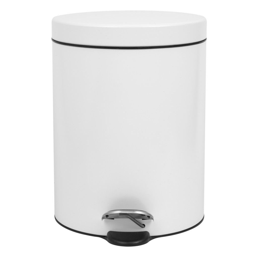 Collecteur à pédale 5L métal blanc. Extérieur en métal et bac intérieur en plastique noir. Protection caoutchouc à la base