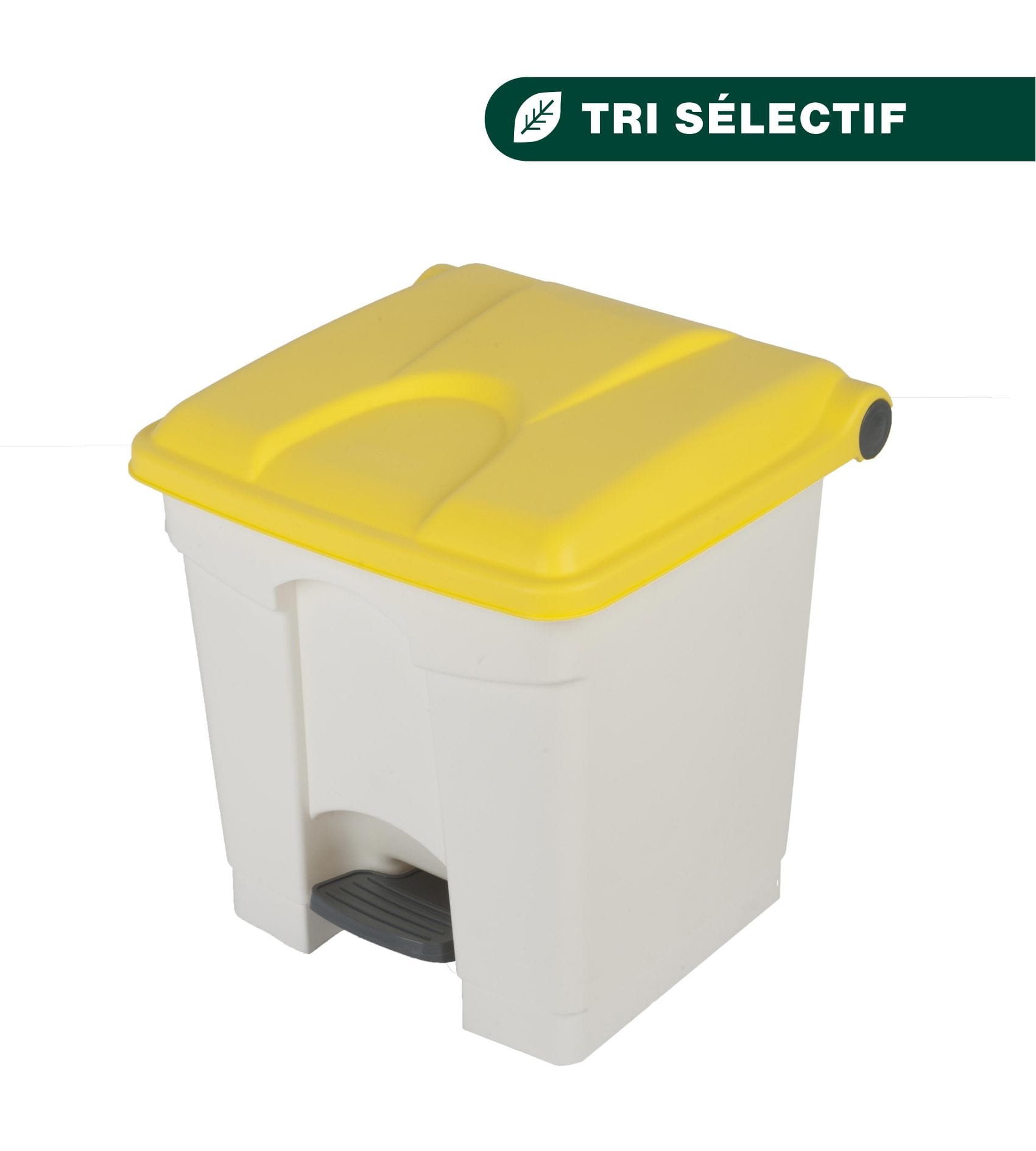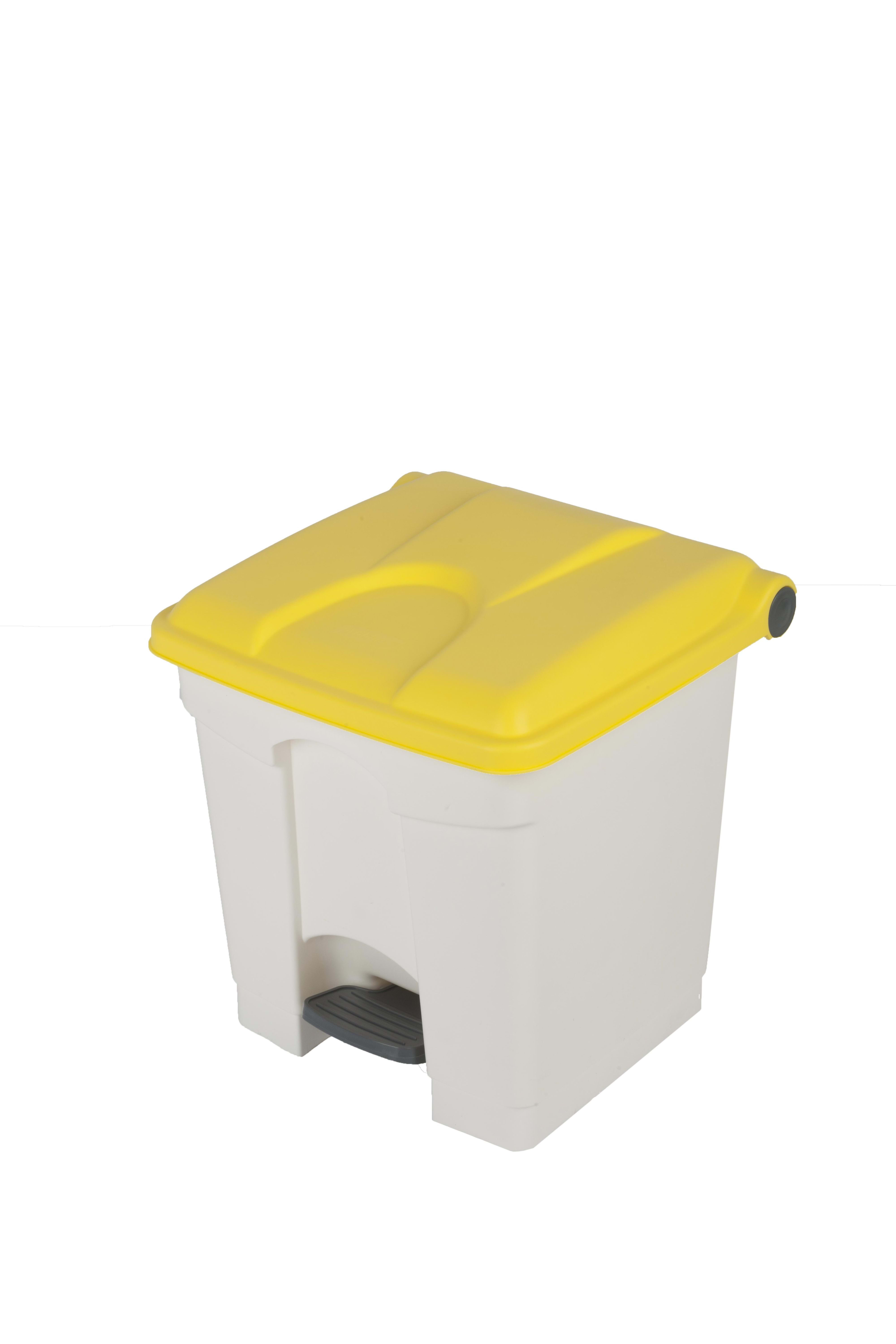 Container 30L blanc couvercle jaune. Container à pédale avec une fermeture automatique du couvercle et autocollants de tri sélectif inclus.