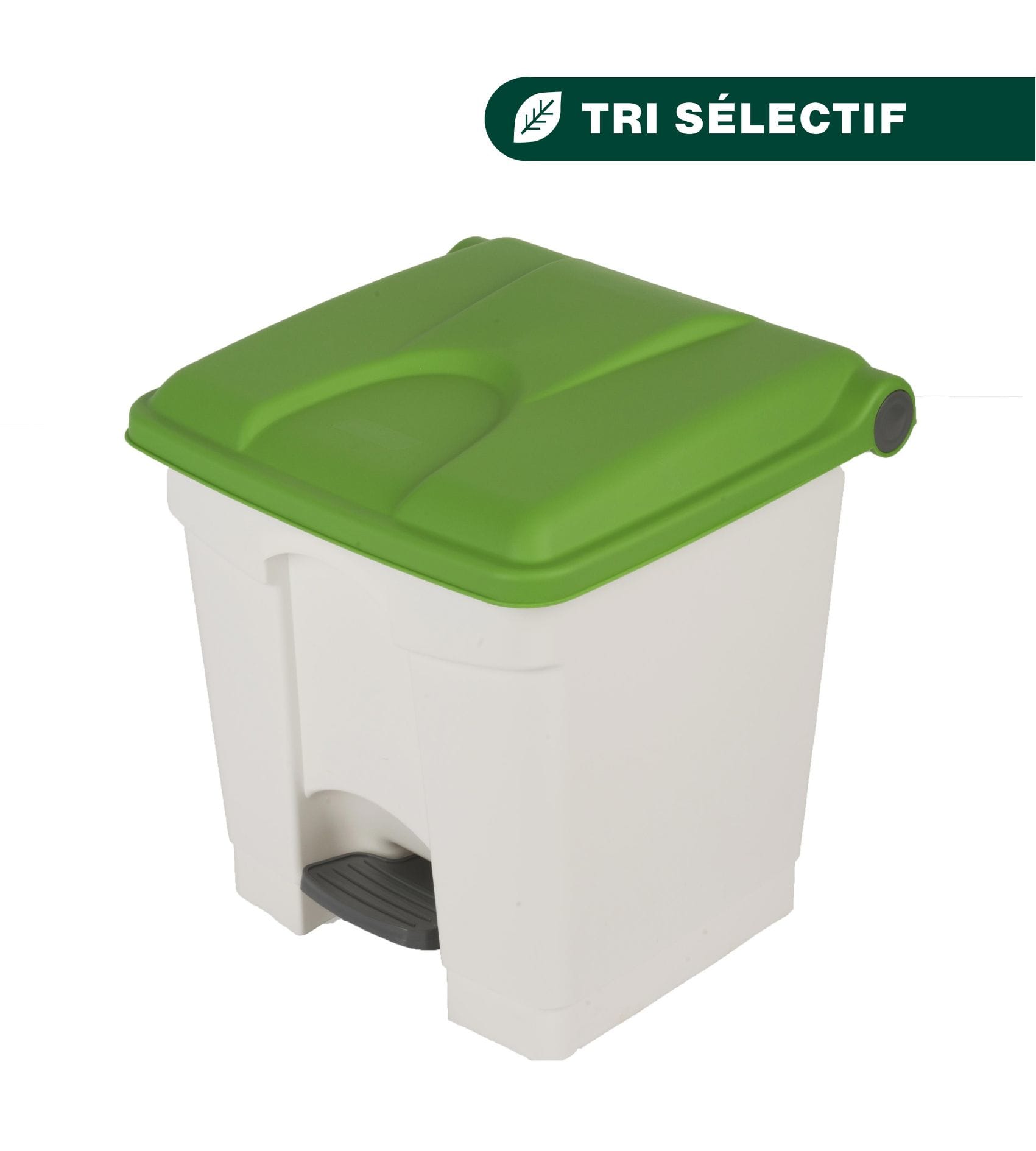 Container 30L blanc couvercle vert. Container à pédale avec une fermeture automatique du couvercle et autocollants de tri sélectif inclus.