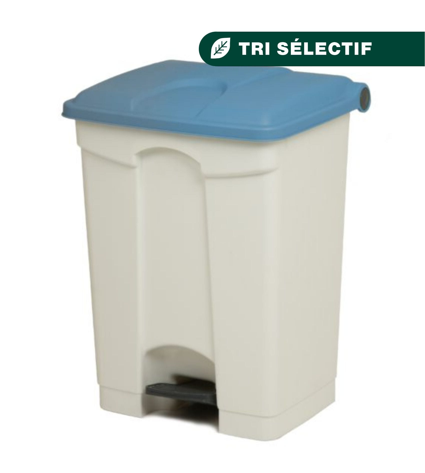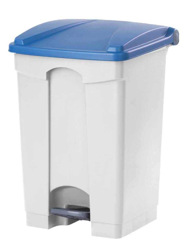 Container 45L blanc avec un couvercle bleu. Container à pédale avec une fermeture automatique du couvercle et autocollants de tri sélectif inclus.
