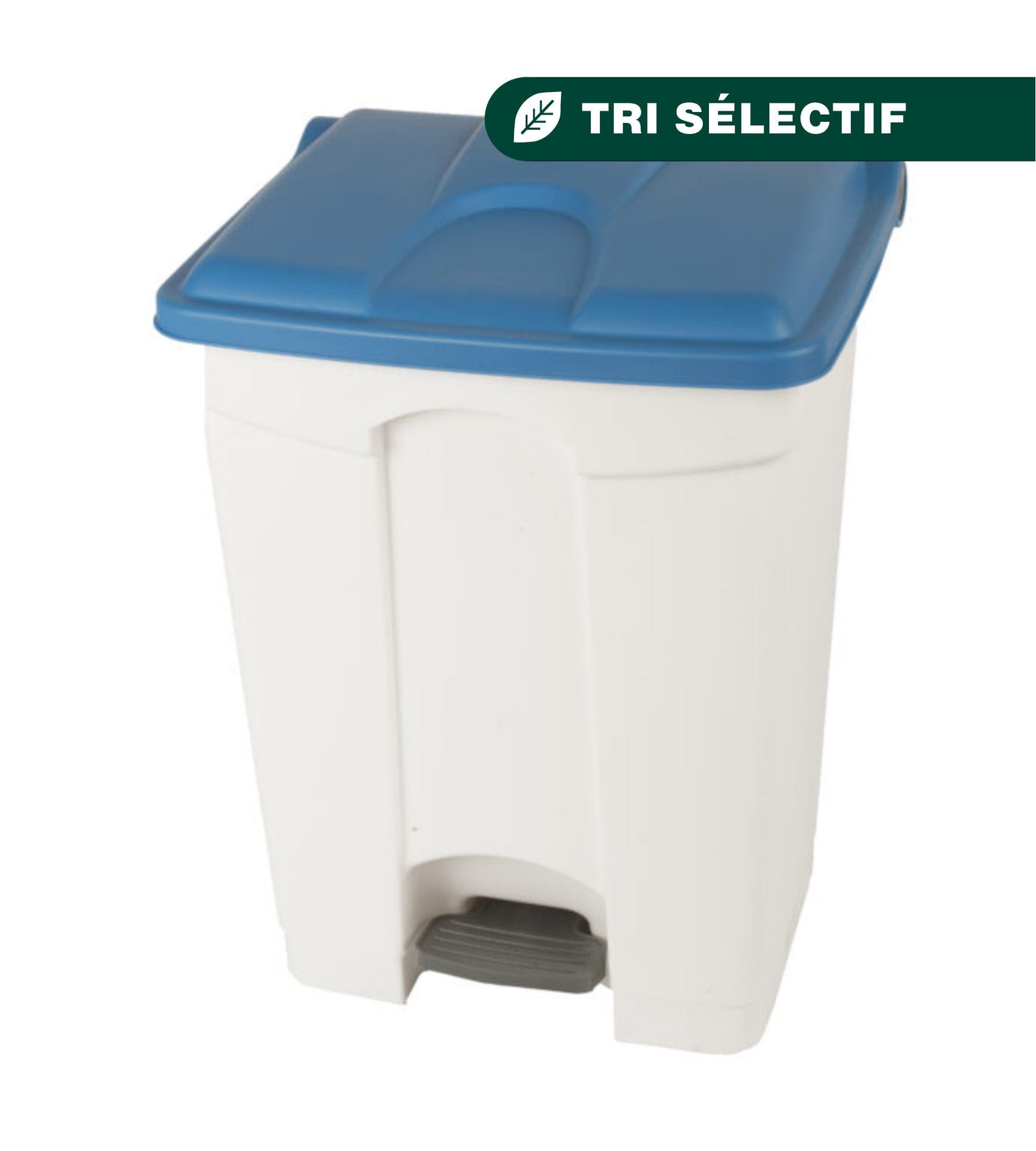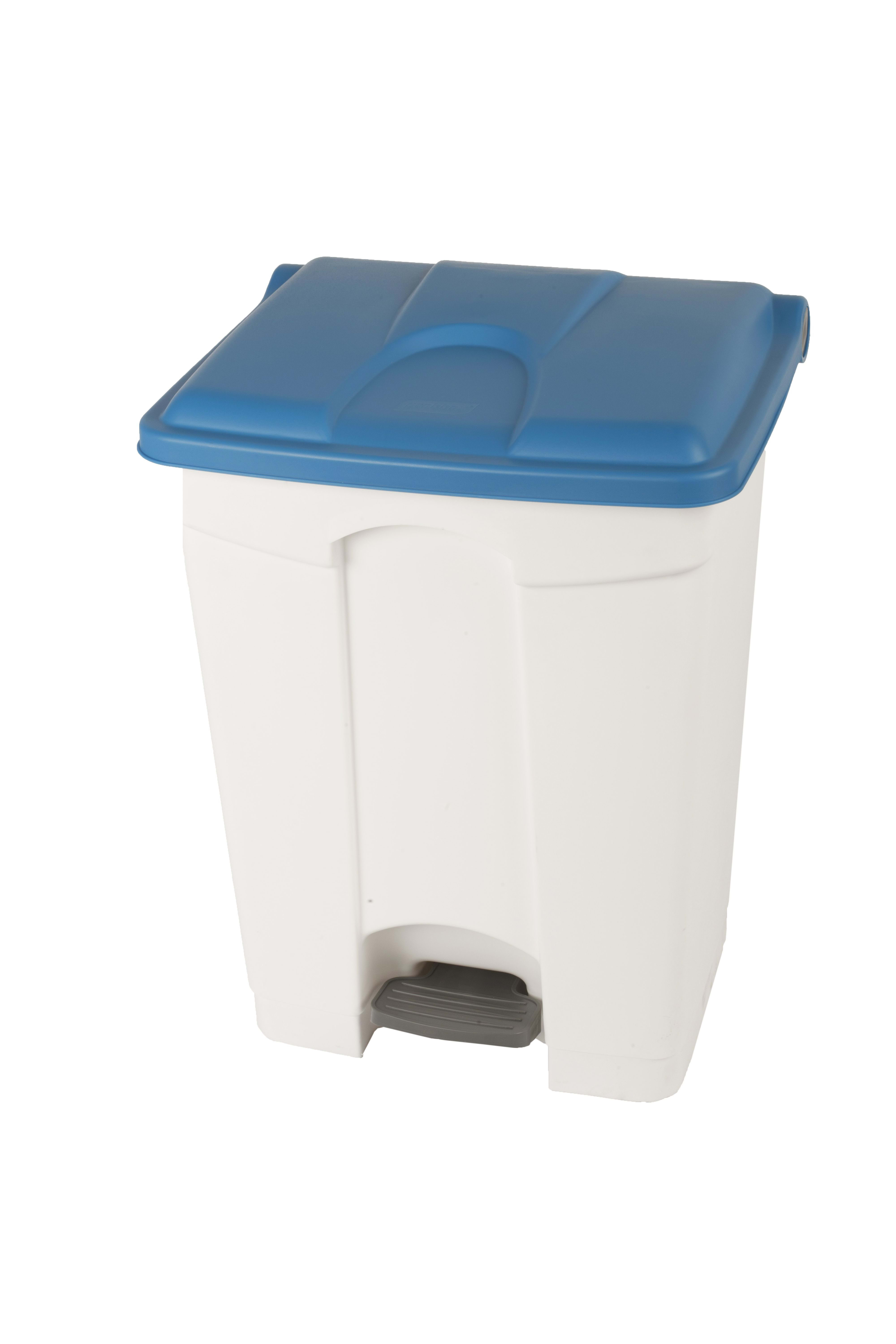 Container 70L blanc avec un couvercle bleu. Container à pédale avec une fermeture automatique du couvercle. Autocollants de tri sélectif inclus.