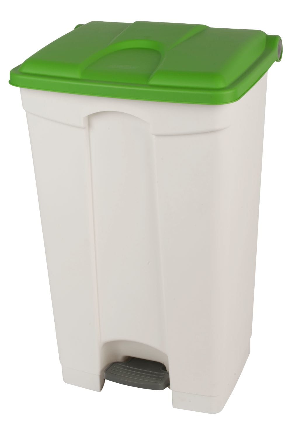 Container 90L blanc couvercle vert à pédale avec un anneau de stabilité et des roulettes de déplacement. Fermeture automatique du couvercle et autocollants de tri sélectif inclus.