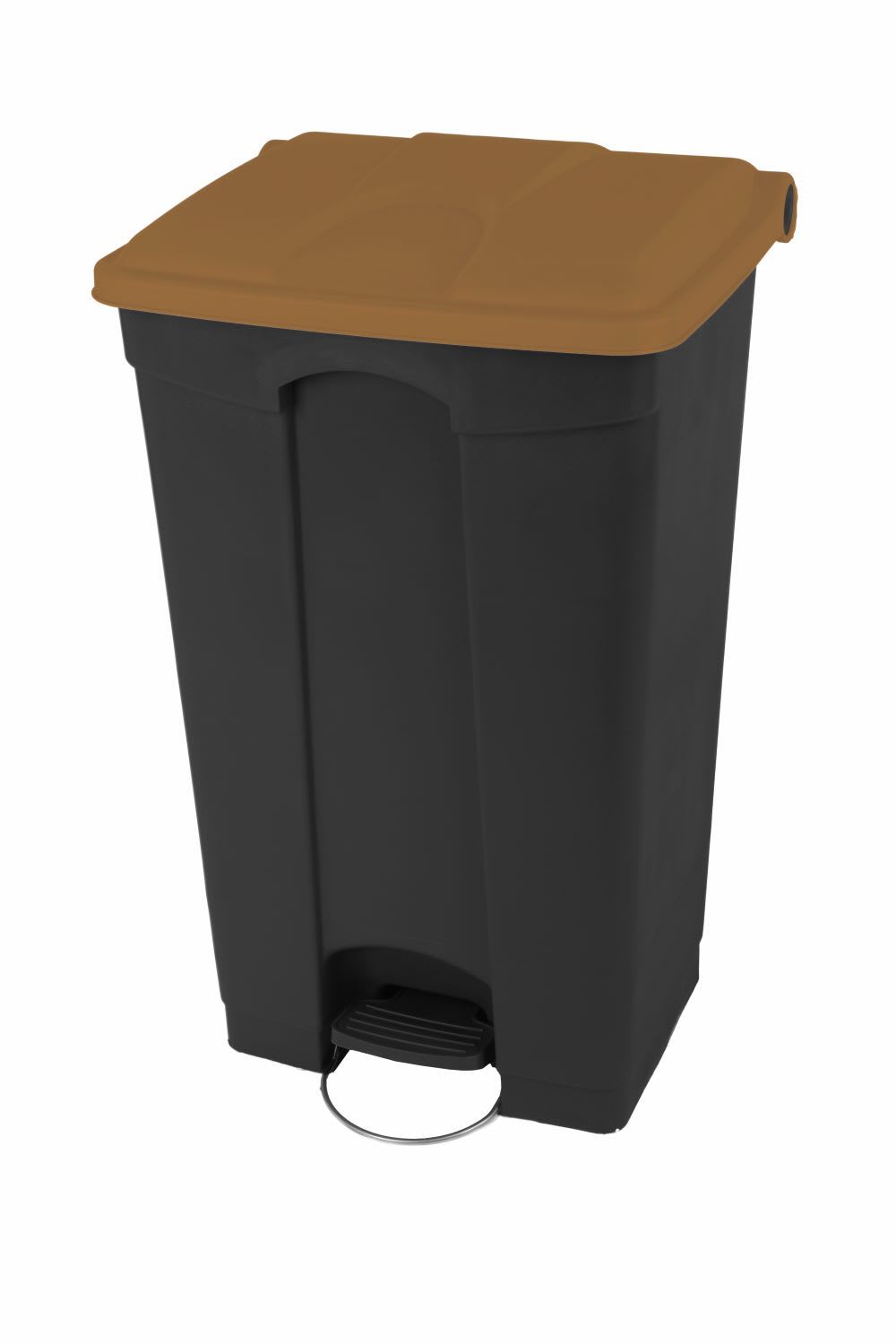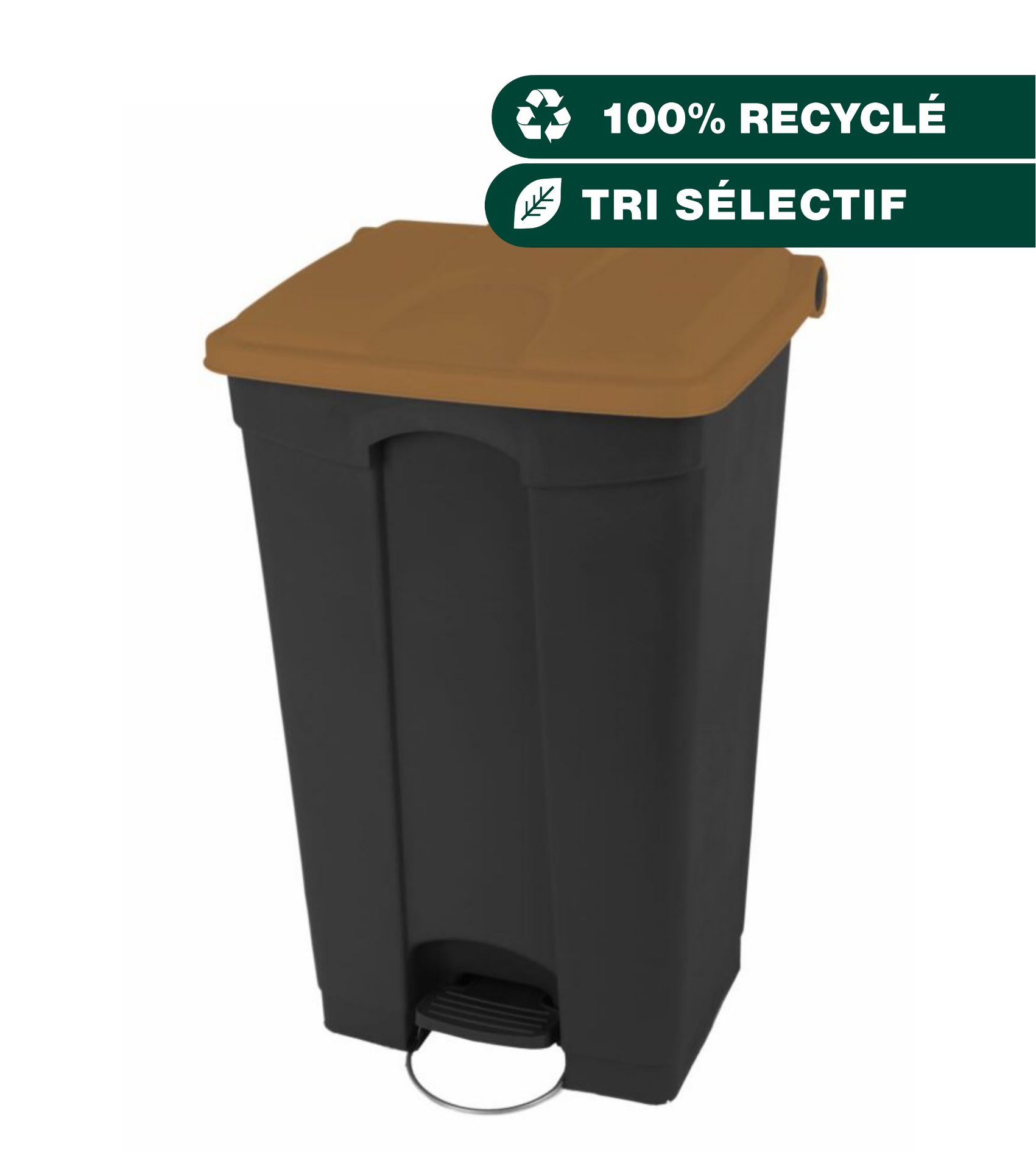 Conteneur spécial biodéchets 90L noir avec couvercle marron. Container à pédale avec des roulettes de déplacement. Utile pour le tri des déchets organiques.