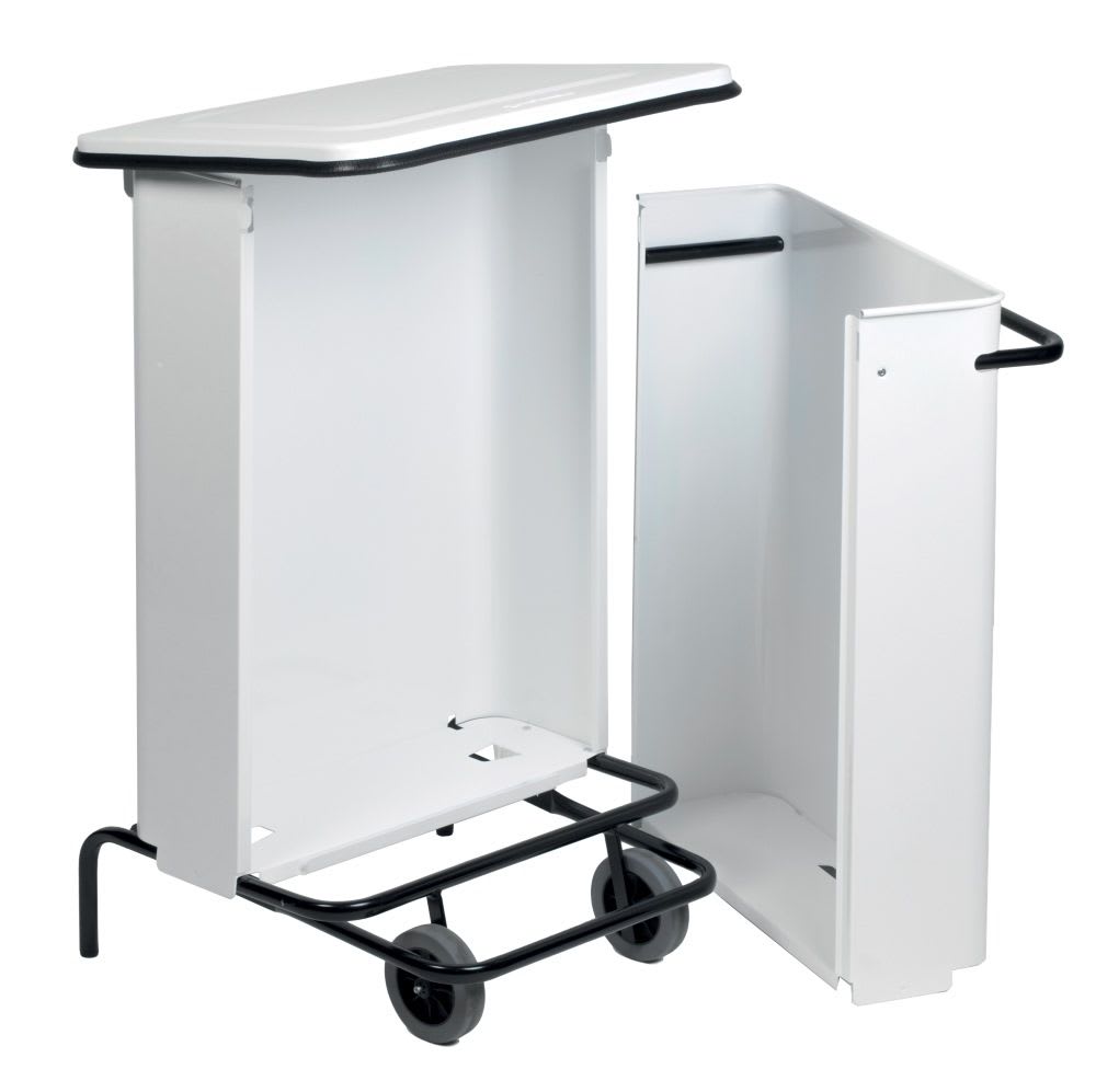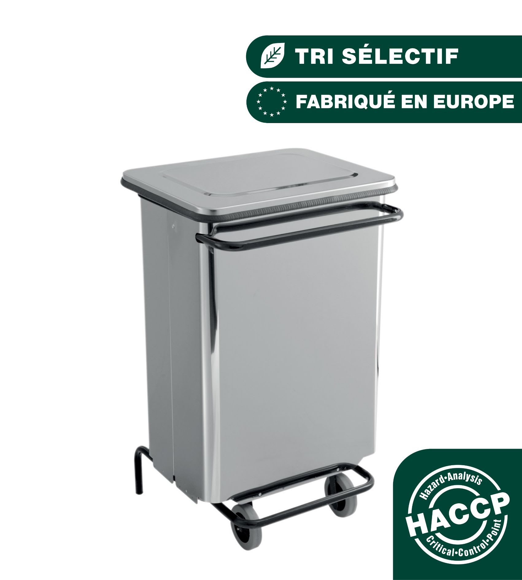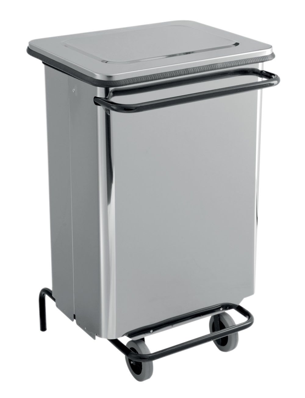 Conteneur mobile 70L Inox brillant avec pédale et poignée en acier poudré époxy. Ouverture frontale pour faciliter l'évacuation du sac de déchet.